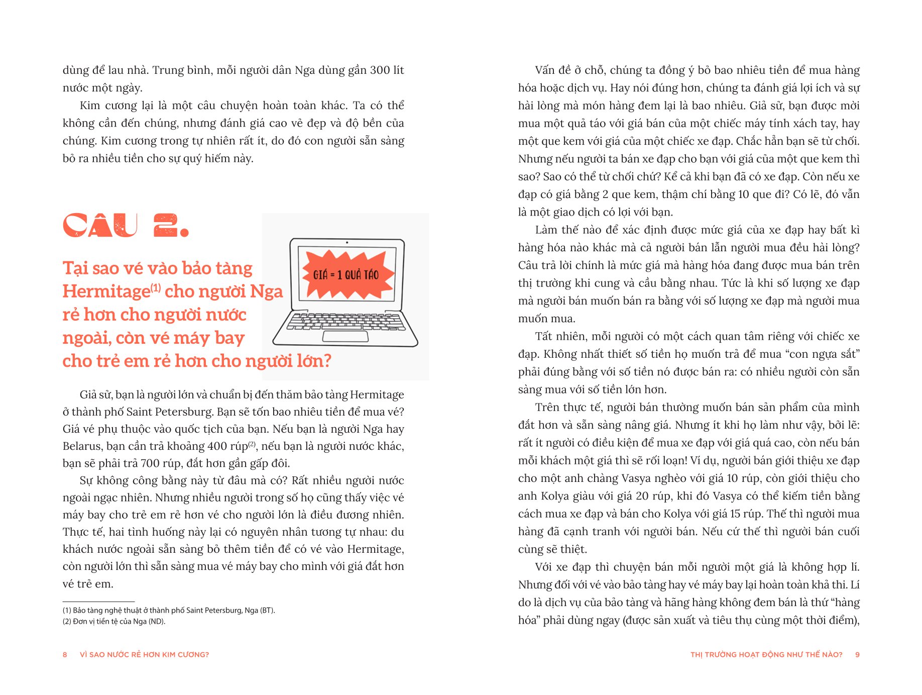 Đã bao giờ bạn tự hỏi: Tại sao dâu tây thường đắt hơn vào mùa đông, hay giá cả khi đi biển nghỉ mát lại đắt hơn vào mùa hè? Tại sao chúng ta phải xếp hàng dài trong viện bảo tàng hoặc siêu thị? Tại sao nhiều lúc chúng ta được đi tiêm miễn phí, nhưng đi chữa răng lại phải bỏ tiền? Chúng ta cần đóng thuế để làm gì và đóng cho ai?... Rất nhiều thắc mắc trong cuộc sống hằng ngày đều liên quan đến quy luật kinh tế, nhưng đôi khi chúng ta gần như không hề nhận ra. Vì Sao Nước Rẻ Hơn Kim Cương? - 48 Câu Hỏi “Xóa Mù” Kinh Tế Học chính là cuốn sách giải đáp những quy luật đó. Theo hình thức hỏi đáp, cuốn sách này sẽ giúp bạn dễ dàng hiểu được nền kinh tế đang vận hành ra sao, dù bạn là thanh thiếu niên hay người trưởng thành, đang là một người tiêu dùng, nhân viên công ty, một nhà tự doanh theo kiểu truyền thống hay đang ấp ủ ý tưởng khởi nghiệp… Bạn sẽ thấy kinh tế học không hề khô khan hay chỉ là chuyện của các chuyên gia. Nhận xét về cuốn sách: “Tác giả hơi khiêm tốn, cuốn sách này rất thú vị với độc giả trẻ, nhưng cũng thu hút sự quan tâm của người trưởng thành.” Giáo sư Vladimir Mau – nguyên Hiệu trưởng Học viện Hành chính Công và Kinh tế Quốc dân Nga, thành viên Đoàn Chủ tịch Hội đồng Kinh tế trực thuộc Tổng thống Liên bang Nga “Đây là một cuốn sách độc đáo, giải thích các khái niệm cơ bản của khoa học kinh tế bằng ngôn ngữ đơn giản, ví dụ từ cuộc sống hằng ngày. Tìm hiểu về kinh tế chưa bao giờ dễ dàng đến thế!” Giáo sư Sergei Guriev - Viện khoa học chính trị Paris