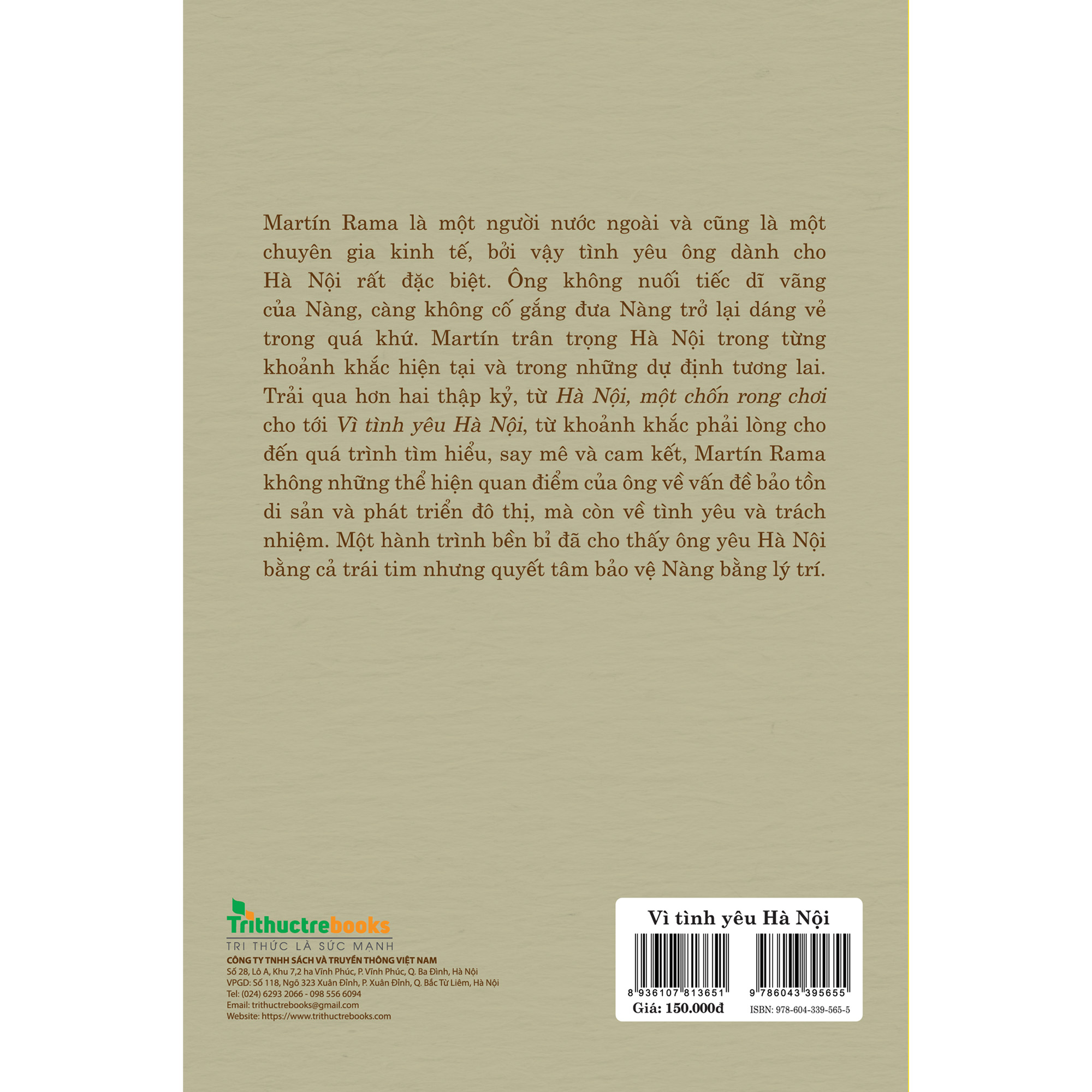 Vì tình yêu Hà Nội của Martín Rama là cuốn sách thứ 9 góp mặt vào tủ sách “Hà Nội Phố và Người” của Công ty TNHH Sách và Truyền thông Việt Nam (Tri Thức Trẻ Books). Thông qua cuốn sách, tác giả Martín Rama muốn chia sẻ một góc nhìn mà trong đó bảo tồn di sản kết hợp hoàn toàn với phát triển kinh tế. Từ đó giúp thành phố được phát triển thịnh vượng trong khi vẫn giữ được bản sắc độc đáo của riêng mình. Và Hà Nội chính là nàng thơ cho ý tưởng này của ông.