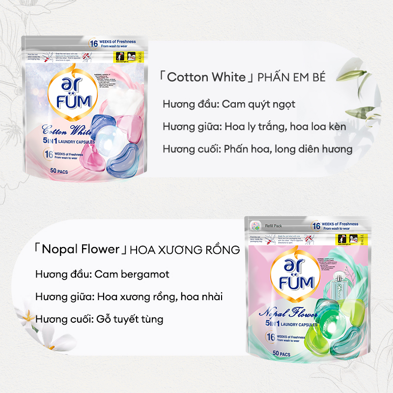 ✨Viên giặt xả arFUM 5 trong 1 MỚI, tinh dầu nước hóa lưu hương lâu 16 tuần, khử khuẩn 99% - (50 viên/Túi)