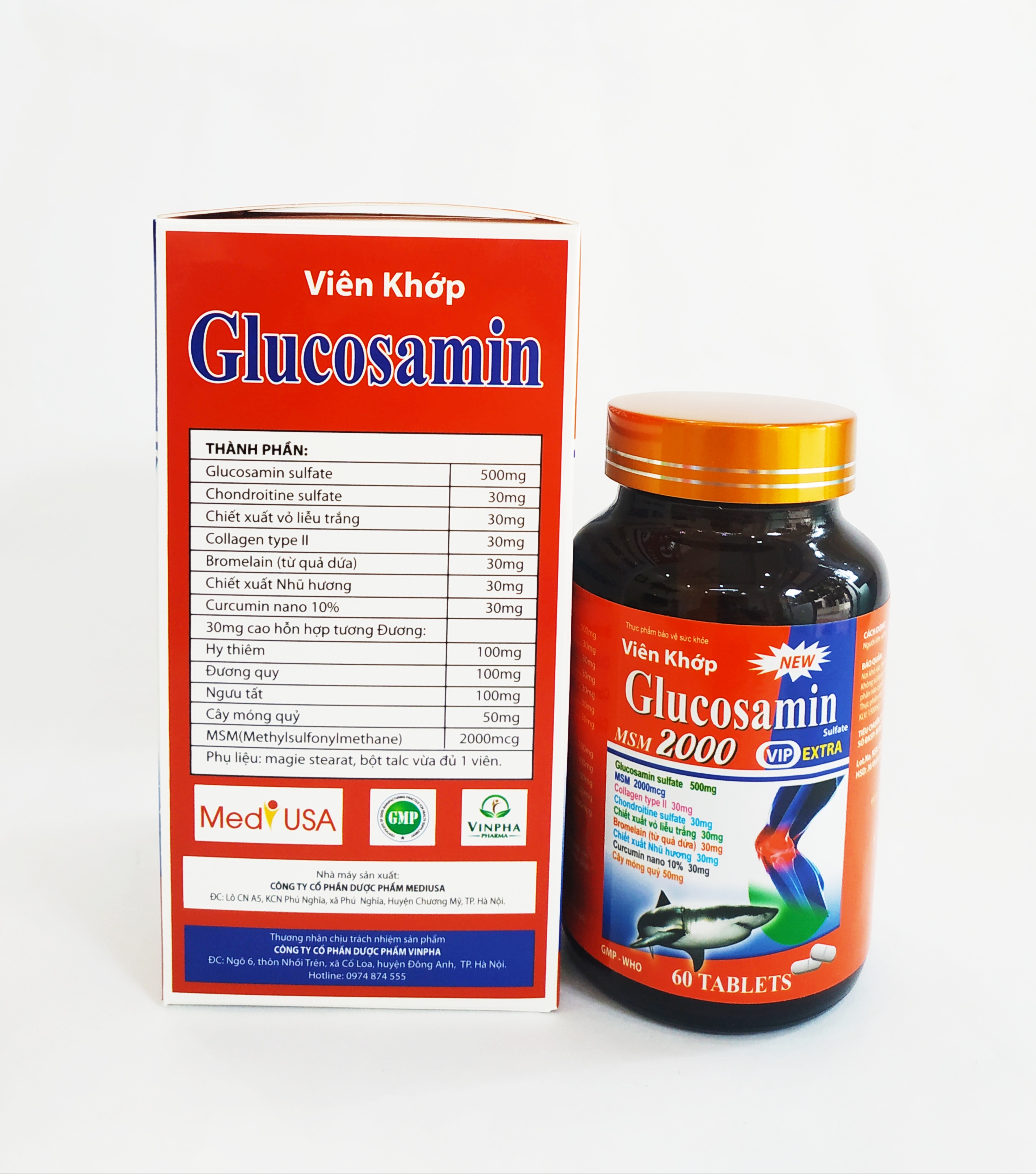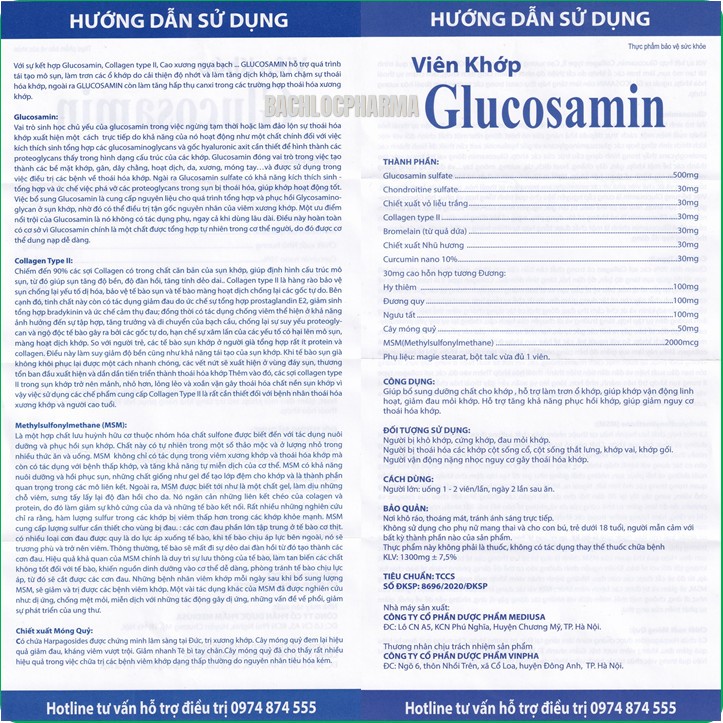 Thông tin chung: Thành phần: - Glucosamin sulfat 2KCl: 750mg - MSM: 120mg - Chondroitin sulfat natri 90%: 50mg - Collagen type 2: 30mg - Bột Sụn vi cá mập: 25mg - Bromelain 2400 GDU/g: