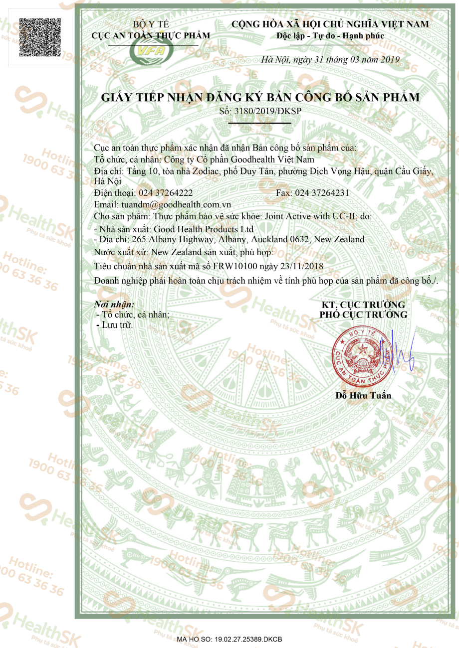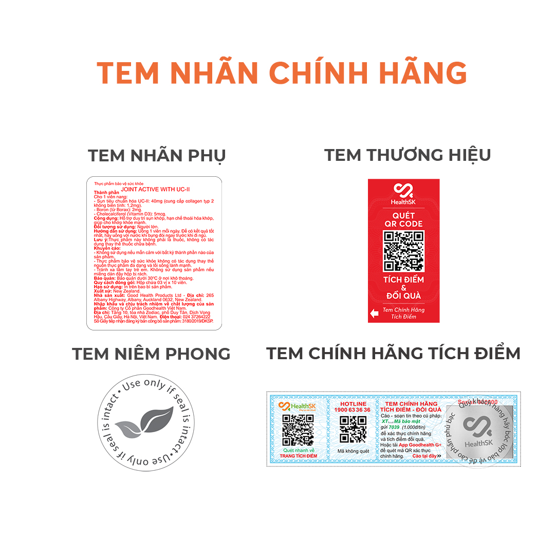 - Phù hợp cho người trưởng thành CÔNG DỤNG Thực phẩm BVSK Goodhealth Joint Active with UC-II (viên sụn khớp Goodhealth) với thành phần chính là UC-II (Collagen tuýp II không biến tính) giúp gỗ trợ duy trì sụn khớp, hỗ trợ hạn chế thoái hóa khớp, hỗ trợ khớp khỏe mạnh. THÀNH PHẦN Trong 1 viên nang cứng TPBVSK Goodhealth Joint Active có: Sụn tiêu chuẩn hóa UC-II 40mg (cung cấp collagen tuýp 2 không biến tính: 1,2mg) Boron (từ Borax) 2mg Cholecalciferol (Vitamin D3) 5mcg ĐỐI TƯỢNG SỬ DỤNG