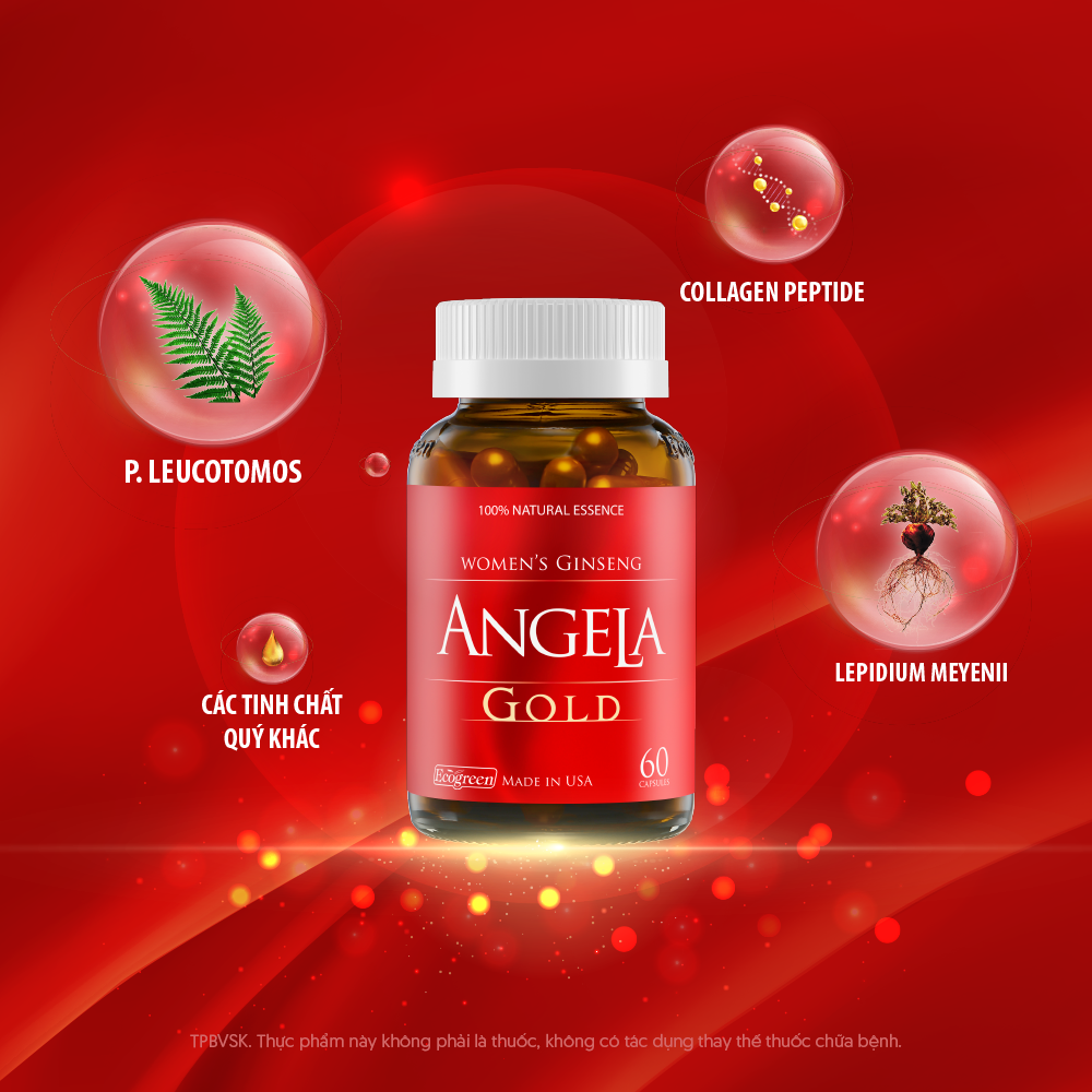 - CÔNG DỤNG CỦA ANGELA GOLD Thực phẩm bảo vệ sức khỏe Women’s Ginseng Angela Gold (Angela Gold) được tinh chiết từ nhiều thảo dược thiên nhiên bằng công nghệ hiện đại tại quốc gia lớn hàng đầu thế giới (Mỹ), nổi bật trong đó phải kể đến tinh chất thiên nhiên Lepidium Meyenii và P. Leucotomos. Nhờ đó, thực phẩm bảo vệ sức khỏe Women’s Ginseng Angela Gold có công dụng: