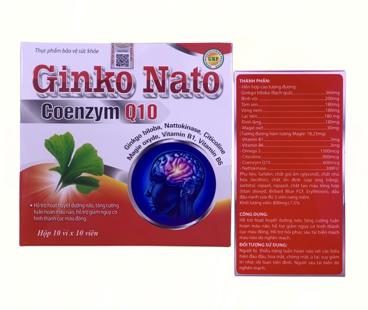 1. THÀNH PHẦN Nattokinase: 300FU Ginkgo biloba extract (tương đương 1200mg ginkgo biloba): 120mg Magnesi oxyd tương đương 30mg magnesi): 83,3mg Bột tỏi đen: 30mg Cao đan sâm: 20mg Citicolin natri: 5mg Coenzym Q10: 5mg