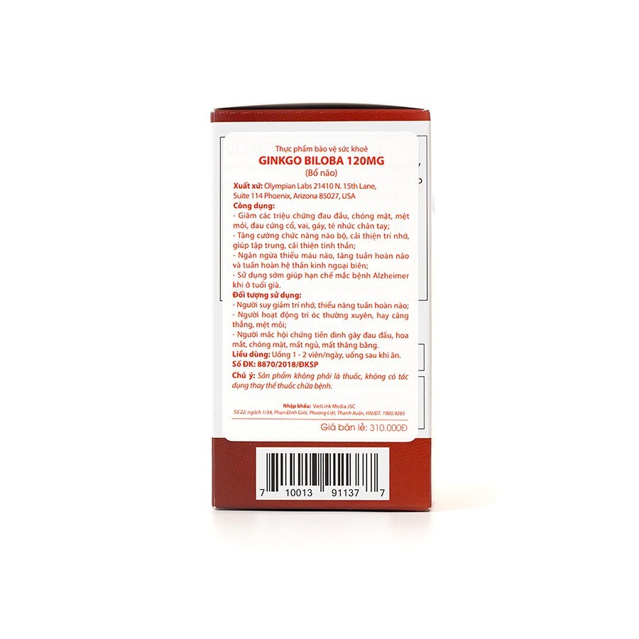 - Ginkgo Biloba 120mg của Olympian Labs là sản phẩm hỗ trợ điều trị các hội chứng đau đầu, chóng mặt, mệt mỏi, các bệnh về não và thần kinh.