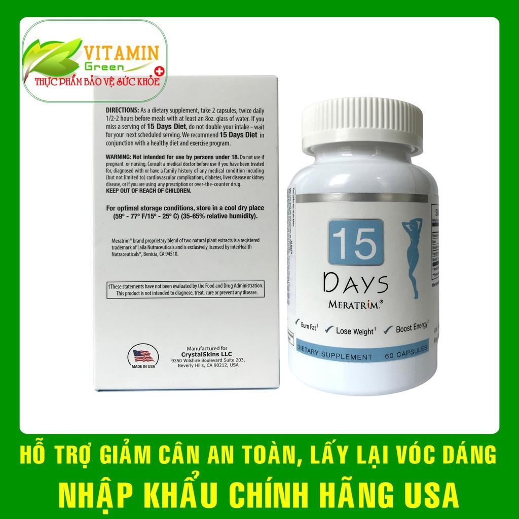 Mua tại TiktokViên uống giảm cân 15 Days Meratrim là thực phẩm bảo vệ sức khỏe được nhập khẩu chính hãng từ Mỹ, sản xuất theo đúng tiêu chuẩn khép kín của nhà đạt tiêu chuẩn GMP.