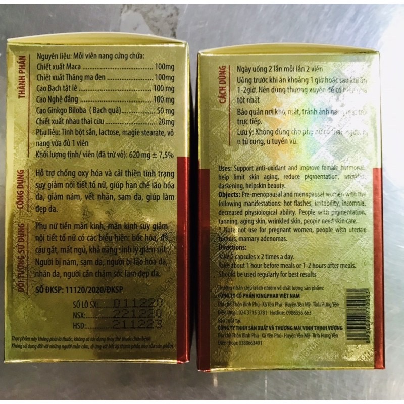 - CÁCH DÙNG - LIỀU DÙNG: Ngày uống 2 lần, mỗi lần 2 viên. Lưu ý không dùng cho phụ nữ có thai. Nên sử dụng một đợt sử dụng từ 3 đến 6 tháng để duy trì hiệu quả tốt nhất. * LƯU Ý : Sản phẩm này không phải là thuốcvà không có tác dụng thay thế thuốcchữabệnh. Bảo quản : Nơi khô ráo, thoáng mát, tránh ánh sáng. **XUẤT XỨ VÀ THƯƠNG NHÂN CHỊU TRÁCH NHIỆM VỀ CHẤT LƯỢNG HÀNG HÓA CÔNG TY CỔ PHẦN KINGPHAR VIỆT NAM Thôn Bình Phú, Xã Yên Phú, Huyện Yên Mỹ, Tỉnh Hưng Yên, Việt Nam Sản Xuất Tại : Công Ty TNHH SX Và TM Vinh Thịnh Vượng Thôn Bình Phú, Xã Yên Phú, Huyện Yên Mỹ, Tỉnh Hưng Yên, Việt Nam