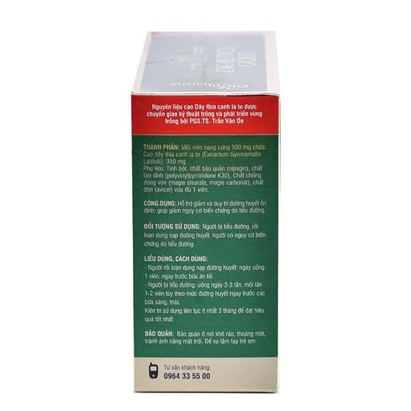 - Hỗ trợ hạn chế nguy cơ biến chứng của người đái tháo đường 3, Đối tượng sử dụng • Người bị tiền tiểu đường, rối loạn dung nạp đường huyết • Người có nguy cơ biến chứng do tiểu đường 4, Bảo quản: Bảo quản ở nơi khô ráo, thoáng mát, tránh ánh nắng mặt trời. Để xa tầm tay trẻ em 5, Lưu ý Người bị tiểu đường phụ thuộc insulin tham khảo ý kiến bác sỹ khi sử dụng Dừng sử dụng sản phẩm nếu có triệu chứng hạ đường huyết quá thấp như biểu hiện rung rẩy, toát mồ hôi... Không sử dụng cho phụ nữ có thai hoặc đang trong thời ký cho con bú Thận trọng với những người có tiền sử dị ứng với các loài trong họ Thiên Lý (Asclepiadaceae) nói chung và chi Gymnema nói riêng 6, Thông tin sản xuất Thương nhân chịu trách nhiệm về chất lượng sản phẩm: CÔNG TY CỔ PHẨN DƯỢC KHOA (DK PHARMA)