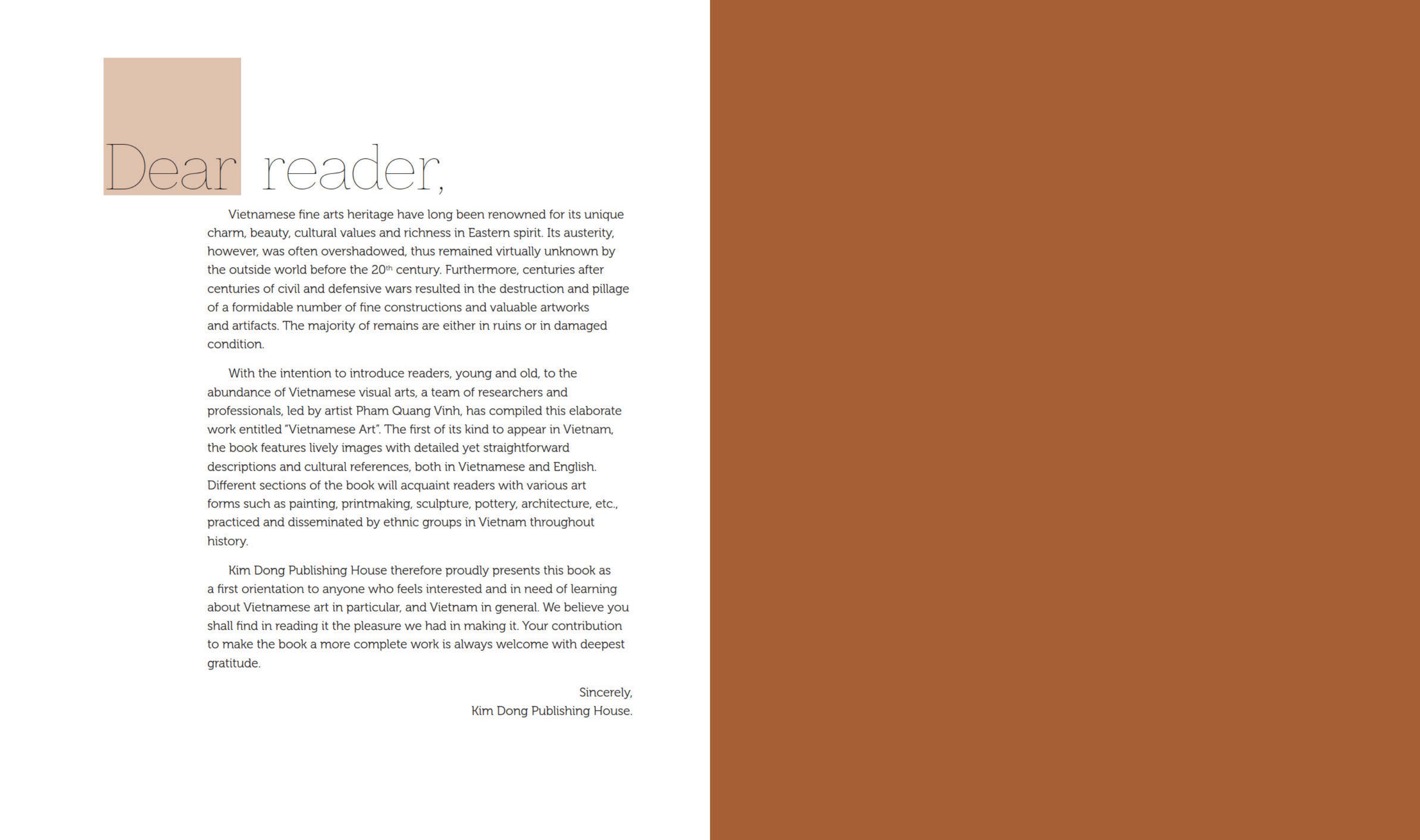 Với mong muốn truyền tải những giá trị và nét đẹp của các tác phẩm nghệ thuật của dân tộc Việt đến bạn độc mọi lứa tuổi, nhóm tác giả, gồm các chuyên gia nghệ thuật và nhà nghiên cứu văn hóa với sự dẫn dắt của họa sĩ Phạm Quang Vinh, đã cho ra đời cuốn sách Nghệ Thuật Việt Nam. Qua những hình ảnh sống động với lời kể chi tiết mà dễ hiểu, cùng các chỉ dẫn văn hóa, mỗi phần trong cuốn sách sẽ giúp bạn đọc làm quen với một hình thái nghệ thuật khác nhau của dân tộc Việt Nam qua tiến trình lịch sử như hội họa, tranh in, điêu khắc, gốm, kiến trúc… Cuốn sách Nghệ Thuật Việt Nam được Nhà xuất bản Kim Đồng giới thiệu lại dưới một hình thức mới, góp phần làm phong phú thêm kho tàng tài liệu dẫn nhập cho bất cứ ai có hứng thú và nhu cầu tìm hiểu về nghệ thuật Việt Nam nói riêng và về Việt Nam nói chung.