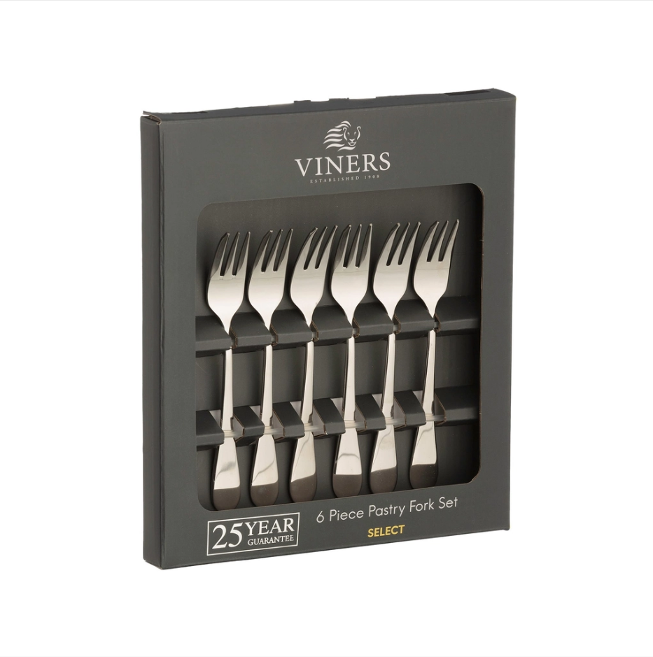 Bộ nĩa Select 6 món được làm từ thép không gỉ 18/0 sáng bóng, khả năng chống gỉ sét cao. Sản phẩm được dùng để thưởng thức bánh ngọt và các món tráng miệng trong