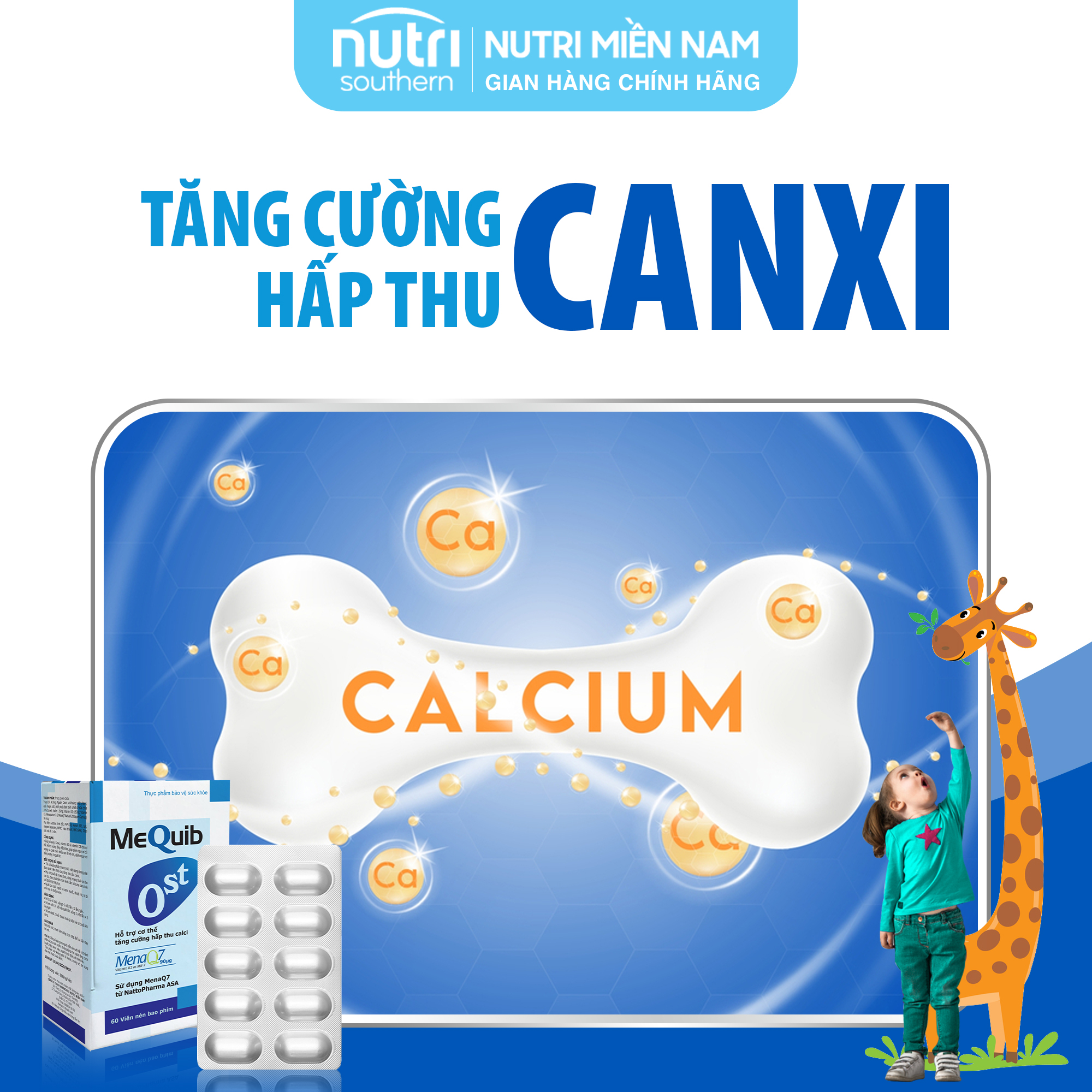 Vitamin D3K2 MK7 (MenaQ7) Và Canxi MEQUIB OST (Hộp 60 Viên) - Tăng Hấp Thu Canxi, Phát Triển Chiều Cao THÀNH PHẦN SẢN PHẨM: -Vitaminn K2 (Menaquinone-7 từ MenaQ7) 90mcg. -Vitamin D3 150IU. -Trucal D7 - Nguồn canxi và khoáng chất natri, kali, magie, sắt, phốt pho được tách chiết từ sữa (chứa 24% Canxi) 417mg. -Inulin 25mg. CÔNG DỤNG SẢN PHẨM: -Giúp bổ sung canxi, Vitamin K2 và Vitamin D3 cho cơ thể. -Hỗ trợ xương răng chắc khỏe, giúp giảm nguy cơ còi xương và phát triển chiều cao ở trẻ em, giảm nguy cơ loãng xương ở người lớn. ĐỐI TƯỢNG SỬ DỤNG: -Trẻ còi xương hoặc thanh thiếu niên đang trong giai đoạn phát triển chiều cao, tăng nhu cầu canxi. -Phụ nữ chuẩn bị mang thai, đang mang thai và cho con bú; đang tuổi tiền mãn kinh cần bổ sung canxi do chế độ ăn bị thiếu hụt. -Người cao tuổi, người hạ canxi huyết, chuột rút, tê bì chân tay do thiếu canxi. HƯỚNG DẪN SỬ DỤNG: -Trẻ từ 2 đến 10 tuổi: Uống 1-2 viên/lần, ngày 2 lần. -Trẻ trên 10 tuổi và người lớn: Uống 2 viên/lần, ngày 2 lần. -Trẻ em dưới 2 tuổi tham khảo ý kiến bác sĩ trước khi dùng. -Thời gian sử dụng: Cùng bữa ăn, dùng hàng ngày ít nhất 3-6 tháng.