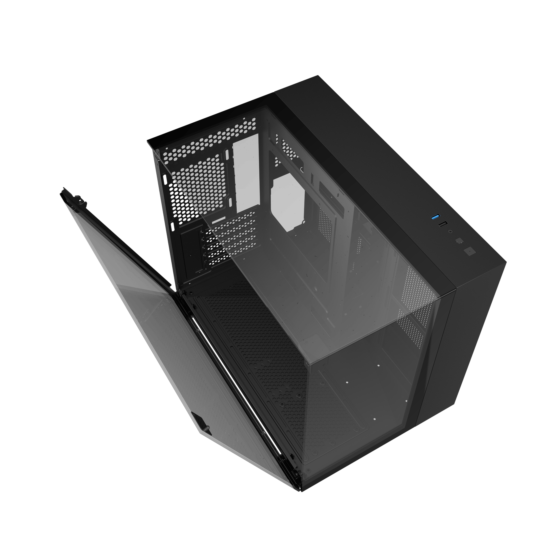 - Khung thân SPCC 0.5T sơn phủ đen - Kích thước nguồn ATX - Kích thước MB ATX - Mặt trước Kính cường lực - Mặt trên Vỏ bọc từ - Mặt trái Kính cường