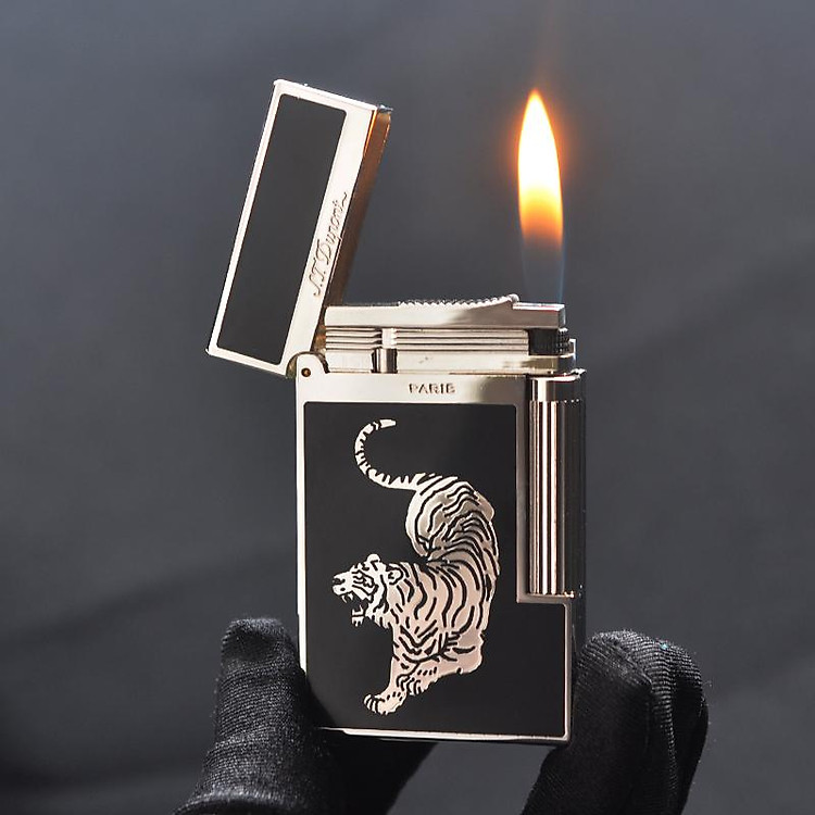 ✨Vỏ Hột Quẹt Bật Lửa Gas Đá S.T Upon D11T Thiết Kế Họa Tiết Sơn Mài Đen Viền Bạc Khắc Hình Con Hổ Độc Đáo