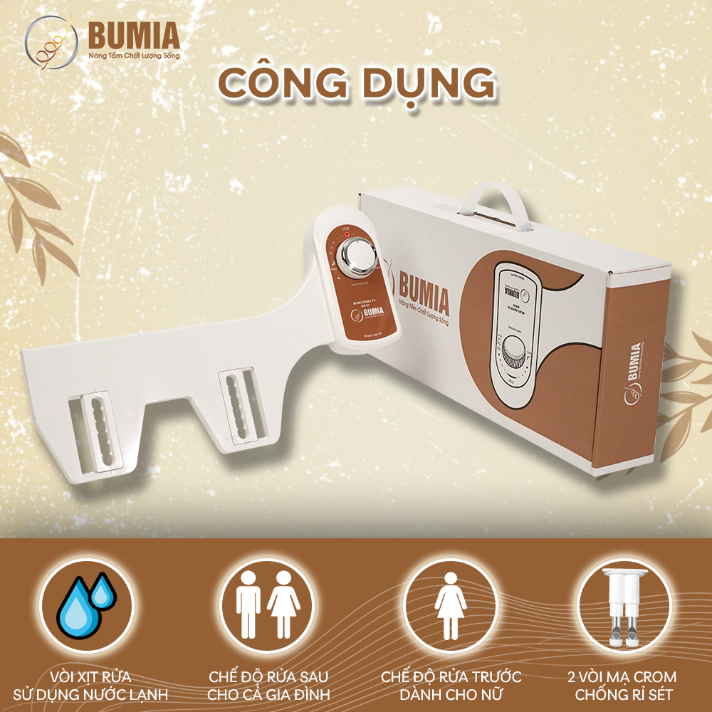 Sản phẩm vòi xịt vệ sinh thông minh bumia bidet có 2 vòi xịt, xịt rửa hậu môn và vệ sinh cho phụ nữ, sản phẩm không dùng điện.