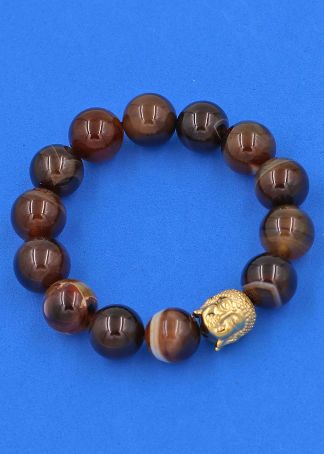 ✨Vòng đeo tay Mã Não Nâu Sọc 14 ly cẩn hạt Phật A Di Đà inox vàng VMNNSNLV14 - hợp mệnh Kim, mệnh Thổ