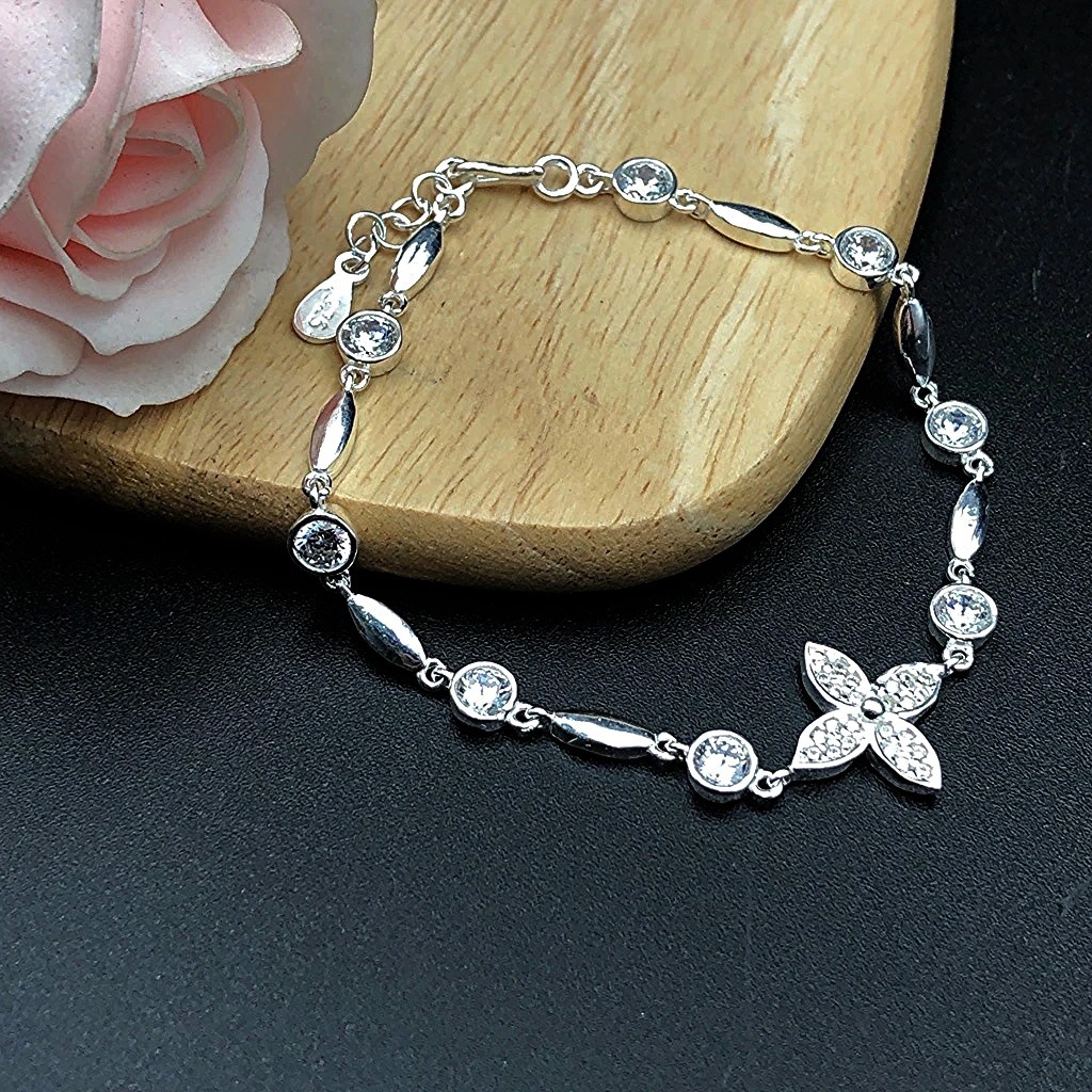 Vòng , Lắc Tay Nữ Bạc 925 Hoa 4 Cánh Đính Đá Cao Cấp Bạc Hiểu Minh LTU578