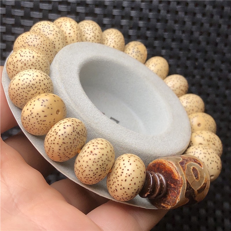 - Đeo lâu sẽ chuyển màu ( lên nước ) , màu sắc hạt có thể chuyển màu vàng ( sau 1-3 tháng ) ; nâu gỗ sậm hơn theo thời gian đeo ( sau 1-2 năm ( tùy vào môi trường, cơ địa người sử dụng) . TẠI SAO GỌI LÀ BỒ ĐỀ TINH NGUYỆT ? Sở dĩ gọi là Bồ Đề Tinh Nguyệt vì mỗi hạt có một chấm to tượng trưng cho trăng, các chấm nhỏ xung quanh tượng trưng cho sao. Bồ đề tinh nguyệt là 1 trong số các chuỗi hạt Quý, Vua Ấn Độ Tỳ Lưu Ly thỉnh Đức Phật Thích Ca dạy cho pháp môn diệt trừ phiền não, Phật dạy nhà vua dùng hạt một loại cây gọi là “Vô Hoạn Tử” hay là “Bồ Đề Tử” xâu thành chuỗi để niệm danh hiệu Phật thì sẽ tiêu trừ mọi phiền não. CÔNG DỤNG CỦA BỒ ĐỀ TINH NGUYỆT : Chuỗi được dùng để lần niệm Phật , đeo tay mang ý nghĩa cát tường, cầu bình an, may mắn, hạnh phúc. Nói về công đức của người lần chuỗi Bồ Đề Niệm Phật, Kinh Hiệu Lượng Sổ Châu Công Đức chép rằng: “Bồ tát Văn Thù Sư Lợi vì muốn đem lợi ích cho mọi hữu tình dùng tâm đại bi bảo đại chúng rằng: – Nếu ai dùng sắt làm tràng hạt mà trì tụng một lần phước bằng 5 lần không niệm. – Nếu ai dùng đồng đỏ làm tràng hạt mà trì tụng một lần phước bằng 10 lần không niệm – Nếu ai dùng thất bảo(vàng, bạc, san hô, hổ phách, mã não…) làm tràng hạt mà trì tụng một lần phước bằng 100 lần không niệm – Nếu ai dùng hạt Mộc hoạn tử làm tràng hạt mà trì tụng một lần phước bằng 1.000 lần không niệm. – Nếu ai dùng hạt sen làm tràng hạt mà trì tụng một lần phước bằng 10.000 lần không niệm. – Nếu ai dùng hạt Bồ đề làm tràng hạt mà cầm, đeo hoặc trì tụng thì phước đức đó không sao tính được. ️️️Thật là duyên lành cho quí vị nào sỡ hữu tràng hạt Bồ Đề Tinh Nguyệt, để hàng ngày có thể chuyên tâm Niệm Phật với những lợi ích lớn không thể nghĩ bàn. Từ xưa đến nay chuỗi hạt Bồ Đề được xem như vật may mắn để mang bên mình. Bạn sẽ cảm thật yên tâm hơn, tự tin hơn khi đeo vòng hạt bồ đề cát tường này