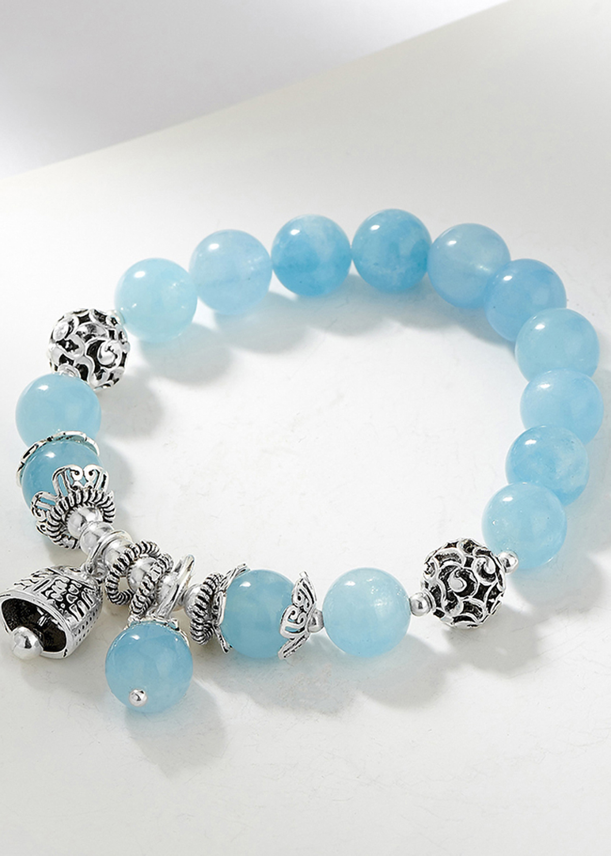 VÒNG TAY ĐÁ AQUAMARINE PHỐI CHUÔNG BẠC: