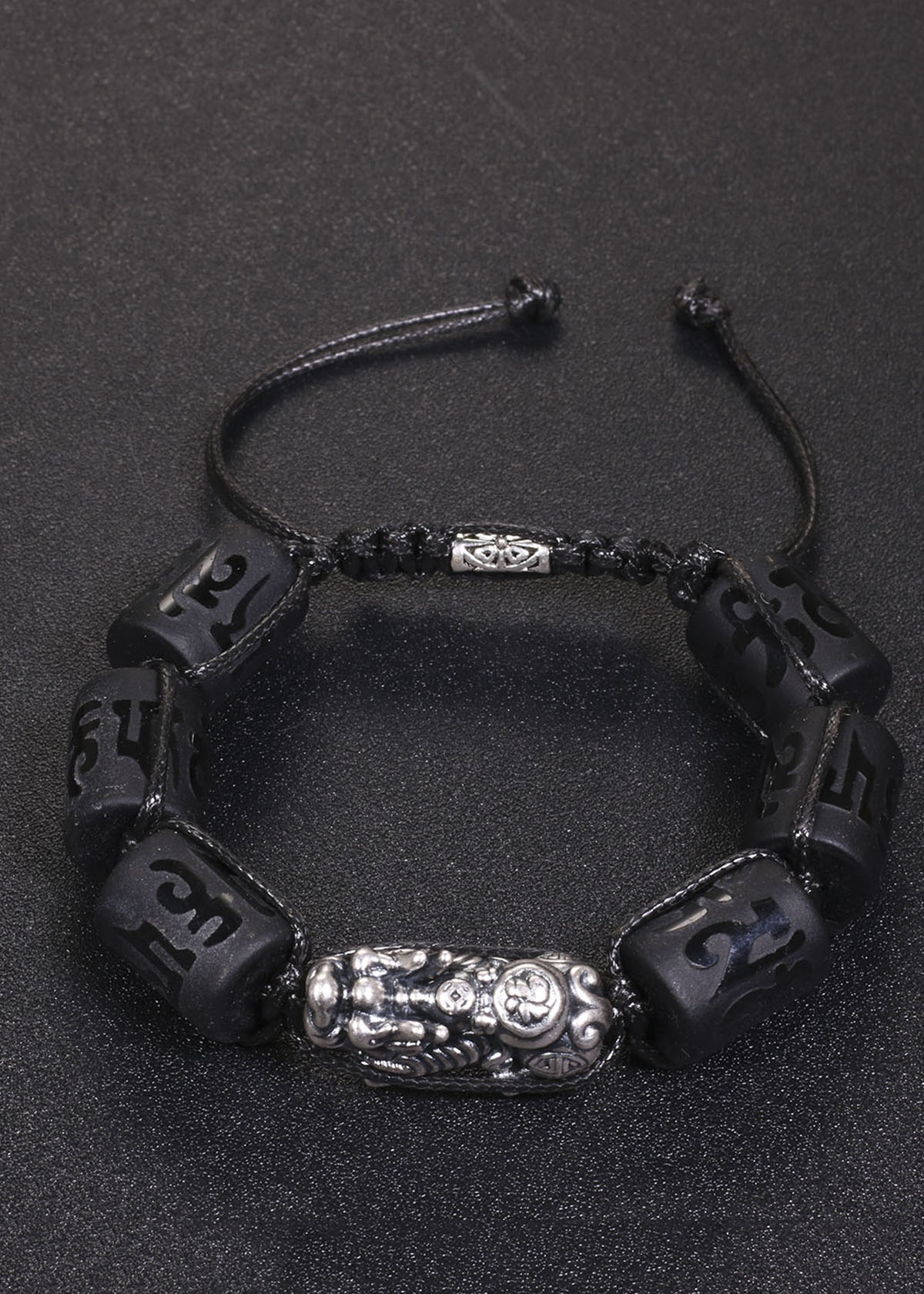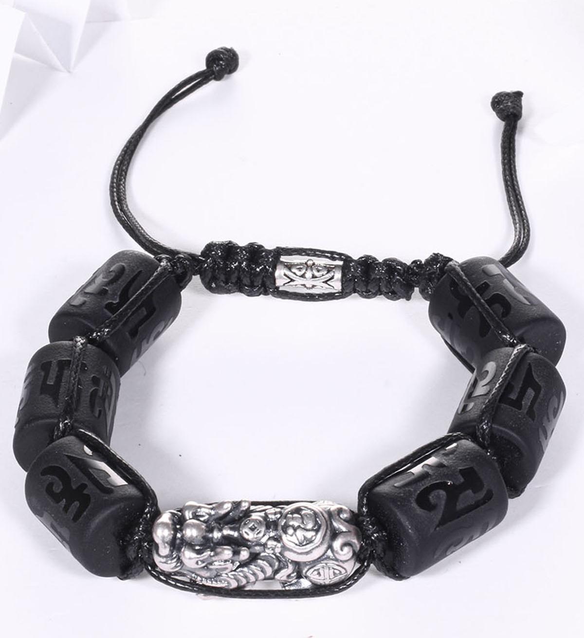 VÒNG TAY ĐÁ OBSIDIAN ĐỐT TRỤ LỤC TỰ ĐẠI MINH CHÚ MIX TỲ HƯU BẠC: Obsidian là viên đá hộ mệnh hấp thu những dụng ý xấu xa, sự ganh đua ghen ghét và tham