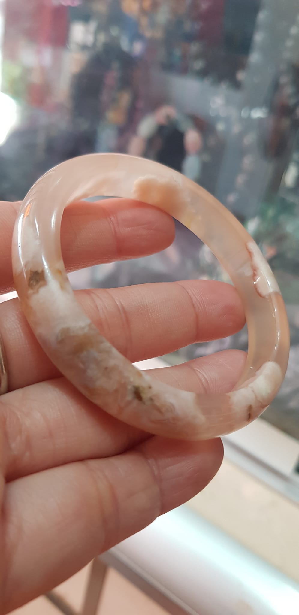 ✨Vòng tay Nữ Bản Hẹ Mới Đá Mã Não Bông Tuyết Hồng nhẹ trắng trong bóng quá đẹp luôn ạ Vòng Ni 53mm x Cao 11mm x dầy 7mm Nữ Cân nặng 52kg - 55kg đeo xinh tay đẹp lắm ạ
