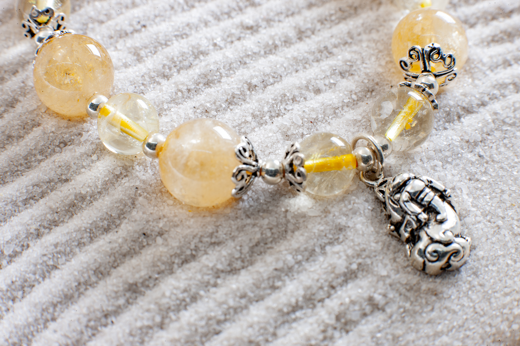Vòng phong thủy citrine tóc vàng được biết đến như một loại đá mang lại bình an, may mắn.