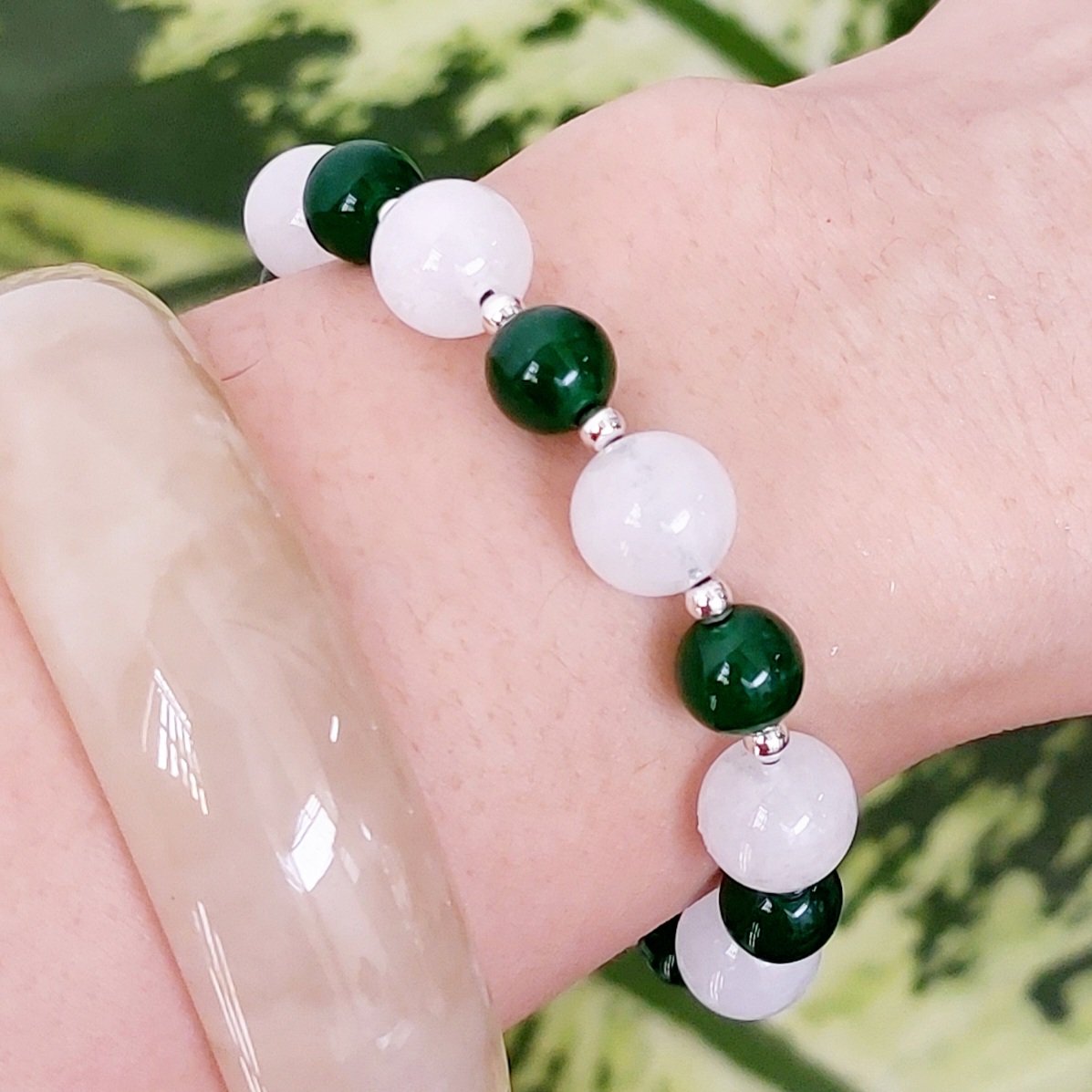 ✨Vòng tay Nữ phong thủy đá mã não trắng mix đá thạch anh xanh và bi bạc kết dây thời trang