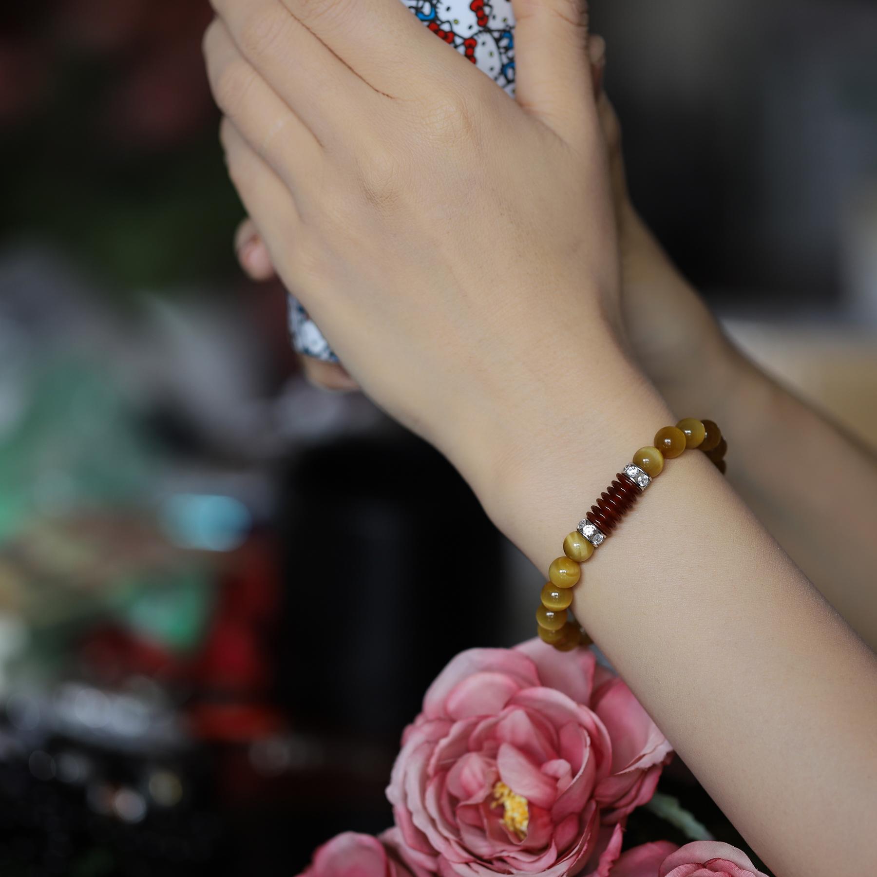 Vòng tay phong thuỷ đá Mắt Hổ Vàng Tâm 8 ly mix Khoen Mã Não by Anqlo là sản phẩm được chế tác tinh xảo, có độ hoàn thiện cao bởi các nghệ nhân lâu