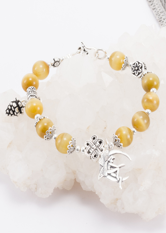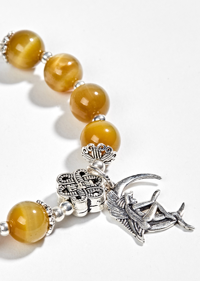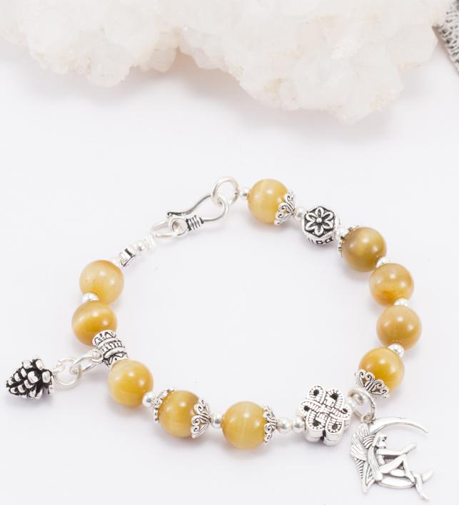 Vòng Thạch Anh Mắt Hổ Vàng Tâm Phối Charm Kết Đồng Tâm Bạc mang lại sự tự tin, dũng khí và giúp cho con người quyết đoán hơn trong công việc, đem đến sự thành công.