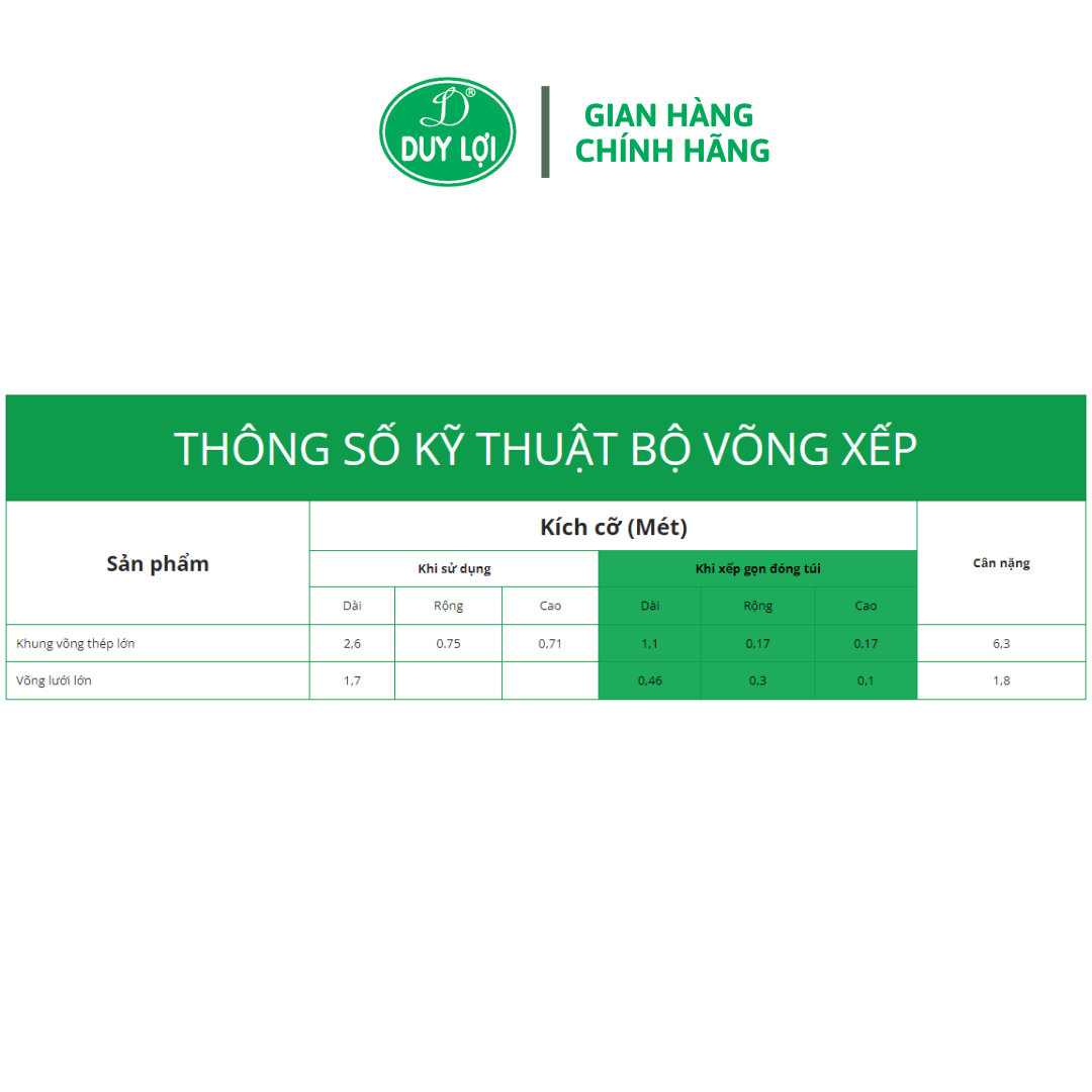 Sản phẩm bao gồm : - Khung võng xếp - Võng lưới lớn, chiều dài phần lưới nằm khoảng 1,7m. - Qùa tặng 10 móc áo kép nhựa cao cấp Duy Lợi Kích thước khung