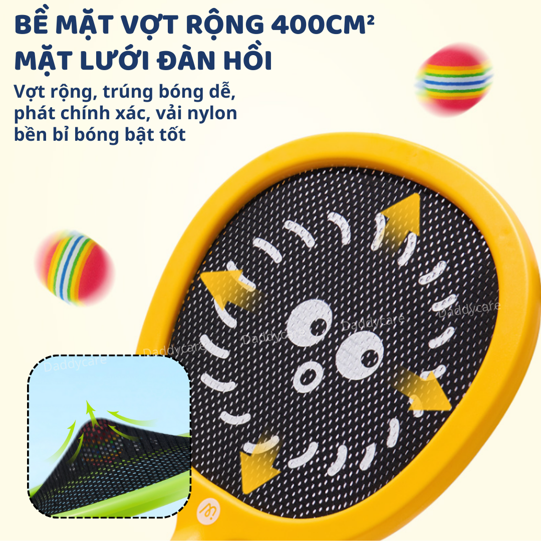 Vợt màu vàng và xanh nõn chuối bắt mắt, giúp trẻ cảm thấy vui vẻ và thích thú hơn khi chơi.