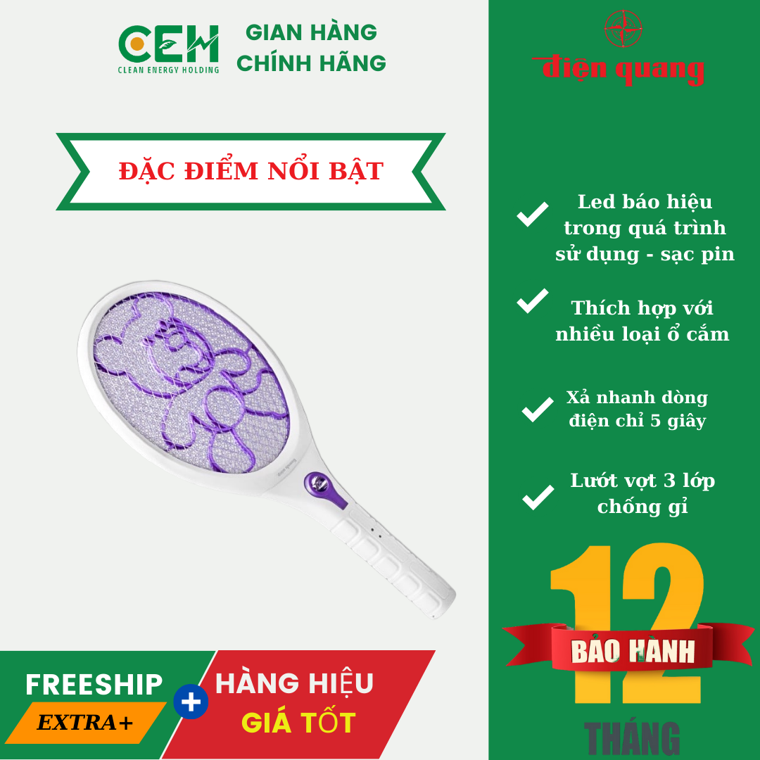 Vợt Muỗi Điện Quang ĐQ EMR04 WP (Trắng - Tím) – Diệt Muỗi Hiệu Quả, An Toàn Tuyệt Đối Từ khóa chính: vợt muỗi Điện Quang, vợt muỗi EMR04 WP, vợt muỗi trắng tím, vợt muỗi 3 lớp lưới, vợt muỗi có đèn LED Đặc điểm nổi bật Lưới điện 3 lớp an toàn: Thiết kế lưới 3 lớp bằng kim loại chống gỉ, đảm bảo hiệu quả diệt muỗi cao và an toàn cho người sử dụng. Chất liệu cao cấp: Vỏ ngoài làm từ nhựa ABS bền bỉ, chịu va đập tốt, dễ dàng vệ sinh khi bám bẩn. Đèn LED tiện ích: Tích hợp đèn LED siêu sáng và đèn báo sạc, giúp người dùng dễ dàng nhận biết trạng thái hoạt động của vợt. Thiết kế tiện lợi: Tay cầm chắc chắn, vừa vặn với lòng bàn tay, thuận tiện cho việc thao tác và bảo quản. Chế độ hoạt động đa dạng: Công tắc 3 chế độ: Bật đèn và diệt muỗi / Diệt muỗi / Tắt, phù hợp với nhu cầu sử dụng khác nhau Thông số kỹ thuật Điện áp đầu vào: 200 – 240V Tần số: 50/60Hz Điện áp pin: 4.3V (DC) Trọng lượng: 372g Màu sắc: Trắng – Tím Bảo hành: 12 tháng chính hãng