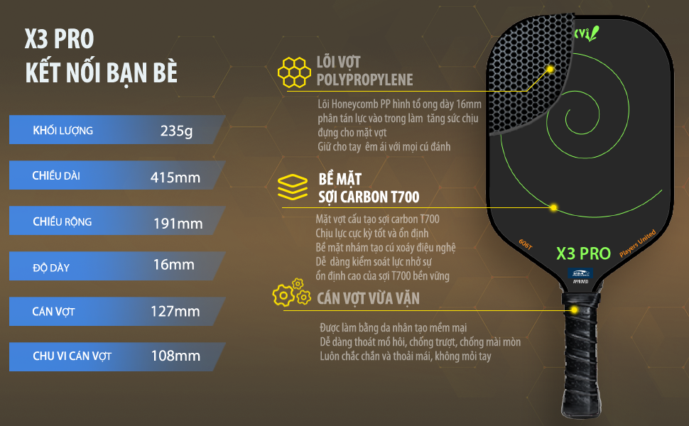- Những người đàn ông biết chia sẻ và vợt pickleball X3 PRO Thể lực của Jim khá dồi dào trên sân pickleball nhưng trong túi vợt pickleball của Jim lúc nào cũng có cây X3 PRO. Những khi giao lưu hay khi gọi tụi trẻ ra dạy chơi pickleball cho mọi người thì Jim dùng và coi đây là trò chơi pickleball. Giải đáp cho nhiều người, Jim nói là chơi pickleball như thế nào với mình rất quan trọng. Pickleball thanh niên thì mặt vợt phải cứng dành cho cú đánh mạnh nhưng khi lựa chọn vợt để giao lưu thì X3 PRO mới thích hợp nhất. Mặt vợt X3 PRO làm từ vật liệu carbon T700 là tấm dệt từ sợi dùng làm vỏ máy bay và thân tàu vũ trụ của ông tỷ phú Elon Musk. Với công nghệ khuôn đúc nóng chân không, sợi carbon cùng với lõi vợt chất liệu Honeycomb PP tổ ong và cạnh vợt bằng Eva Foarm được làm nóng và hút vào khuôn chân không. Chính vì vậy, vợt X3 PRO liền khối, khi chạm bóng, lực sẽ dàn đều nhờ cấu trúc tổ ong của lõi vợt. Mặt vợt có độ nhám của sợi carbon T700 tạo phản lực và người chơi có thể kiểm soát dễ dàng đường bóng. Đây là lý do Jim chọn X3 PRO để hướng đường bóng theo ý “giao lưu” của mình. Vợt pickleball X3 PRO có độ dày là 16mm nhưng khối lượng chỉ 235g nên X3 PRO không gây mỏi tay khi luyện tập và thi đấu. Đây là điểm cộng với các anh nam giới tham gia pickleball theo ý giao lưu và là lựa chọn khó thay thế của các tay vợt nữ, những người ưa sự nhẹ nhàng khi vận động. Với Jim, khi học chơi pickleball thì thấm nhuần chơi pickleball như thế nào là vô cùng quan trọng. Jim nói đùa là pickleball gái xinh nhiều nên anh phải nhẹ nhàng để lấy lòng. Vợt đánh pickleball X3 PRO giúp kiểm soát bóng giúp bạn chơi thấy hài lòng. Bên cạnh cấu tạo vợt pickleball và cách chơi là quan trọng thì Jim cho là túi đồ pickleball có trang phục play together bí quyết để hòa đồng bạn bè từ nhiều nơi khác nhau. Jim cũng chia sẻ rằng nếu bạn quan tâm top vợt pickleball thì phải có kinh nghiệm mua vợt pickleball. Xịn là là phải tìm đến vợt được USAPICKLEBALL APPROVED. Cách tra cứu là: Kiểm tra USAPickleball Approved cho cây vợt X3 PRO
