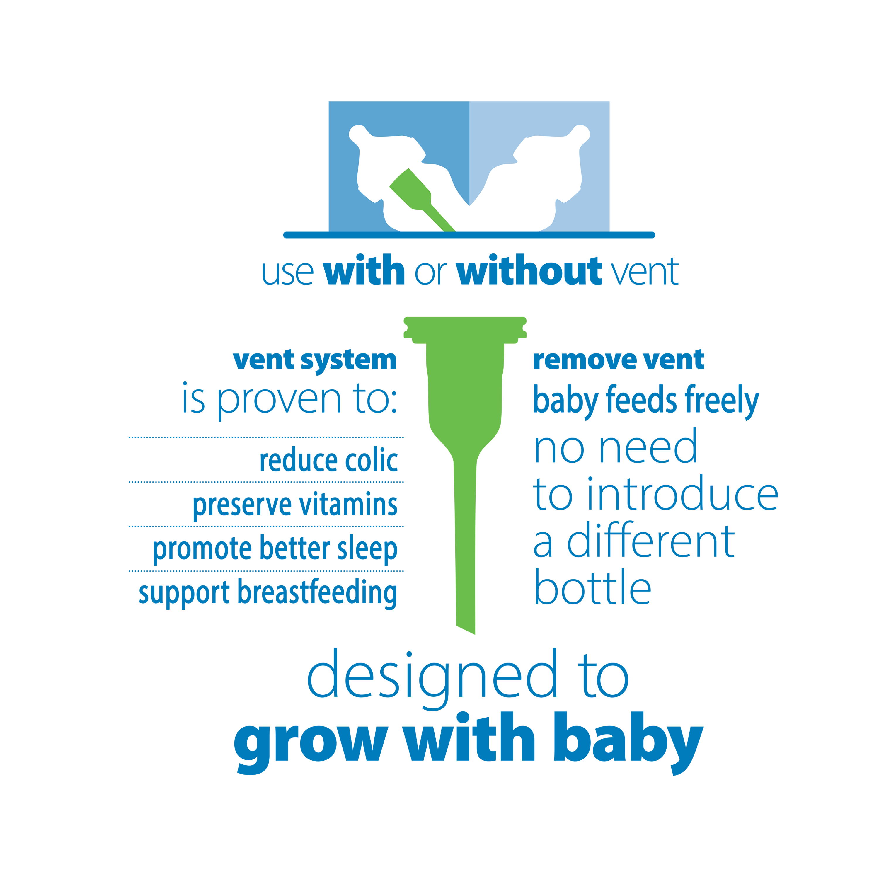 - Khi bé lớn lên, hệ tiêu hóa đã phát triển hoàn chỉnh, bạn có thể lựa chọn sử dụng dùng hoặc không dùng đến hệ thống van khí + Khi không dùng hệ thống van khí bên trong, không khí sẽ đi qua rãnh khí dưới đáy núm ty, giúp cân bằng áp suất bình sữa giống như các bình sữa thông thường khác trên thị trường, và bình vẫn có tính năng chống sặc sữa, không làm sẹp núm ty