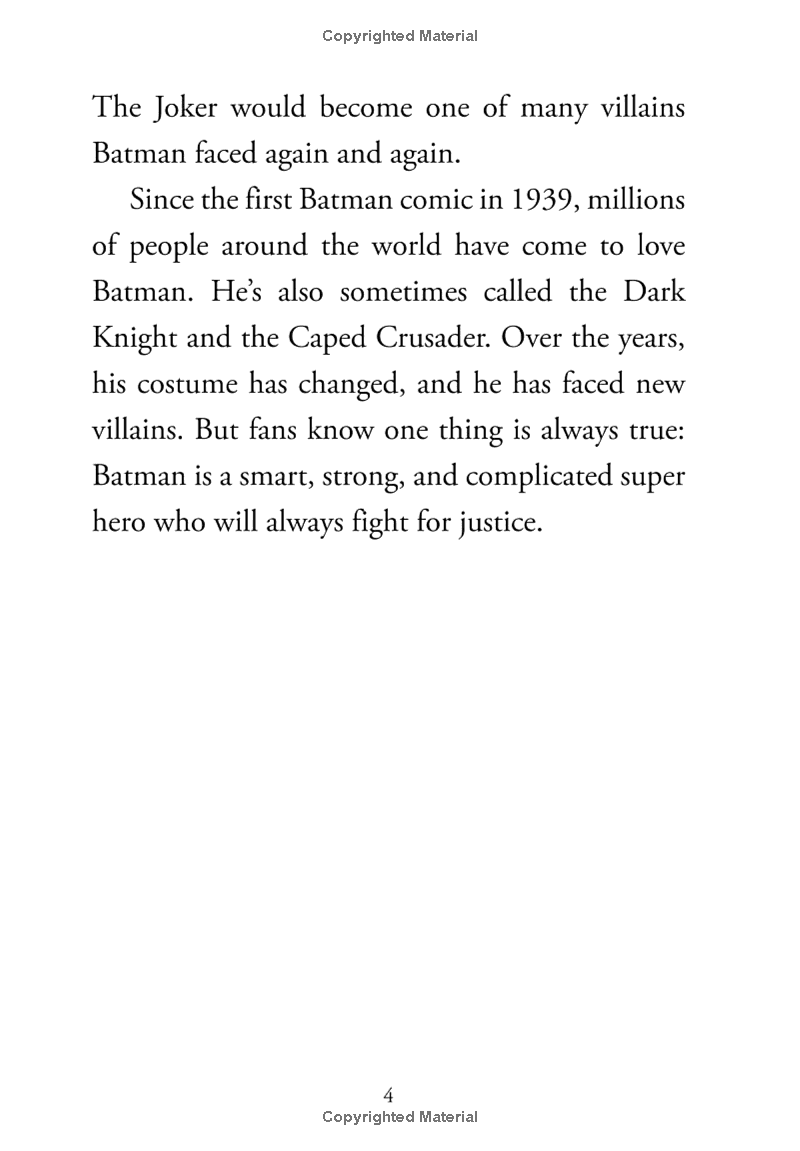 Bruce Wayne, a wealthy American philanthropist and business owner, and Batman, his crime-fighting alter ego, have been entertaining audiences since 1939. The character was so popular after appearing in Detective Comics that DC Comics decided to give Batman a comic book of his own. In doing so, they created one of the company's most successful franchises. Author Michael Burgan details the history of Batman--from his tragic origin story and his infamous arch enemies--to his iconic depictions in television and movies throughout the years. This book shows readers why this superhero with no superpowers is so beloved around the world.