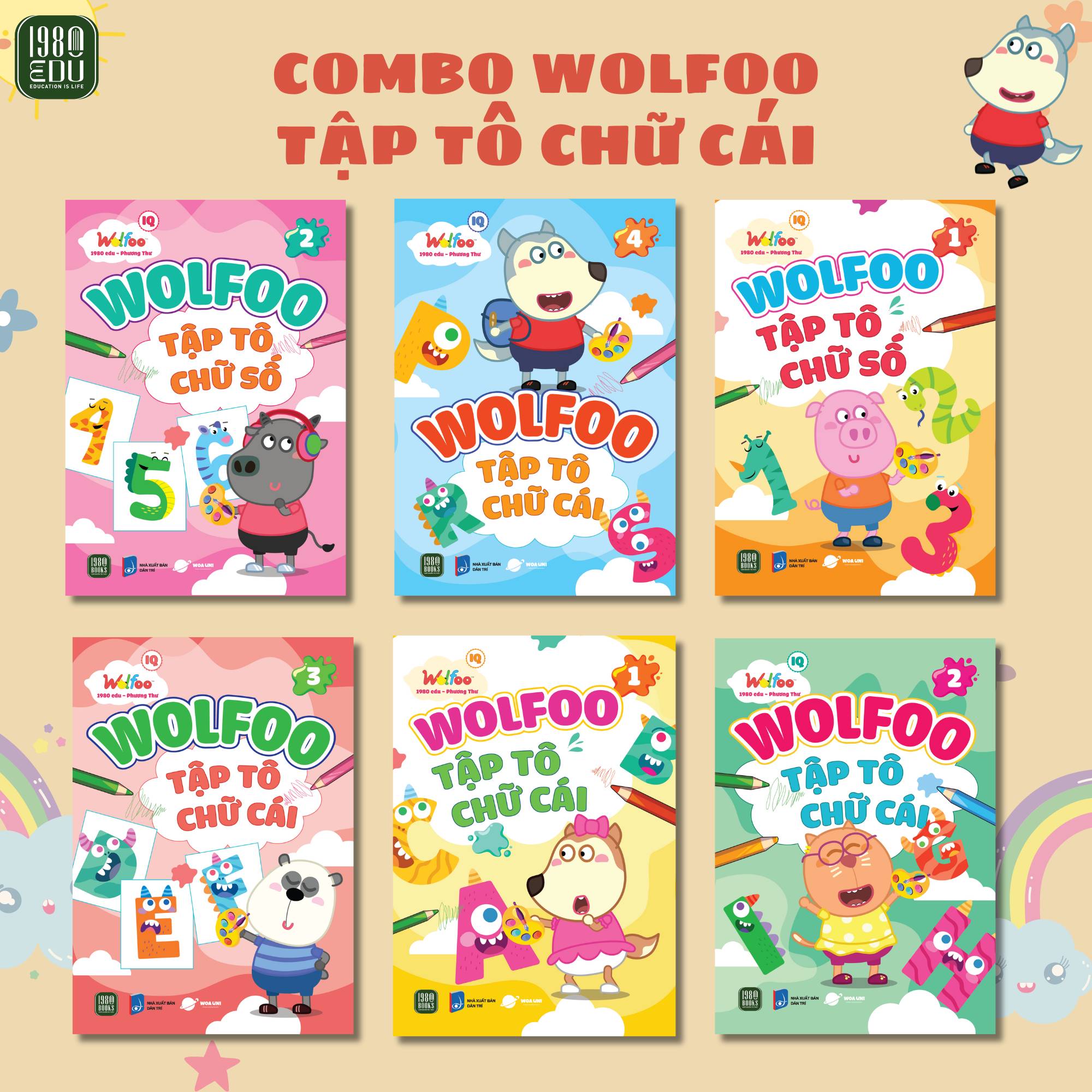 Giới thiệu sách Bộ sách Wolfoo tập tô chữ cái và chữ số bao gồm 6 cuốn giúp bé làm quen, nhận biết và tập viết 29 chữ cái tiếng Việt và chữ số từ 1 đến 10. =>Bộ sách Wolfoo Tập tô chữ cái và chữ số gồm 6 cuốn: