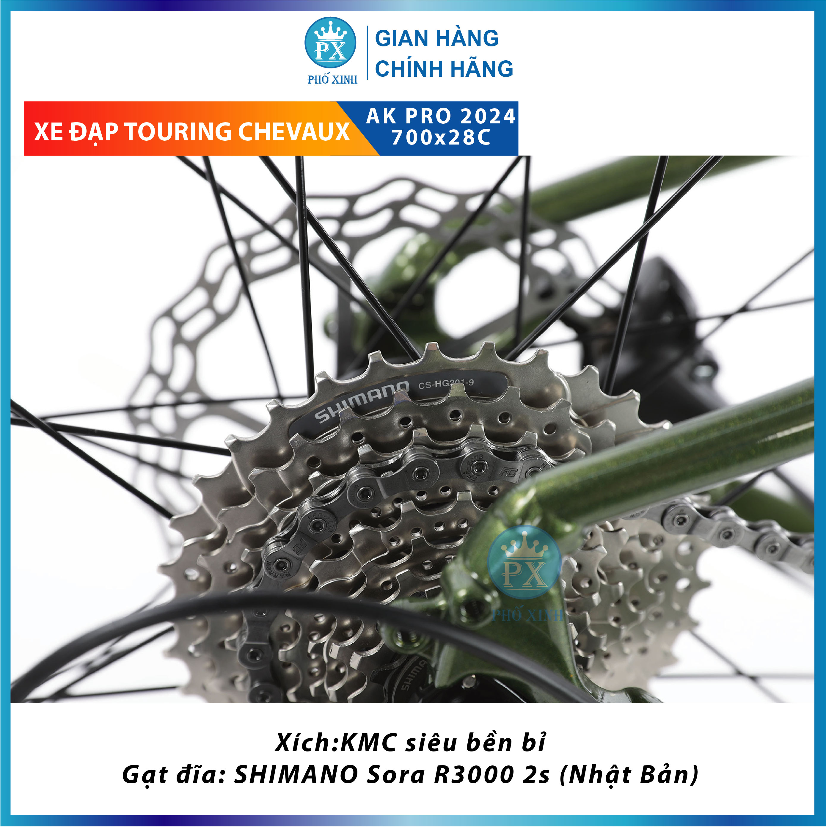 XE ĐẠP CHEVAUX AK PRO 2024 Xe đạp Chevaux Ak Pro 2024 là mẫu xe đạp có cấu hình tốt nhất trong các dòng xe đạp touring của thương hiệu Ngựa Chiến Chevaux được chính thức đưa về thị trường Việt Nam. Với sự cải tiến và đồng bộ 7 món Shimano – đặc biệt bộ đề Shimano Sora, mẫu xe này đảm bảo sẽ là người bạn đồng hành đáng tin và đáng mến của mọi người! Thông số kỹ thuật Model CHEVAUX AK PRO 2024 Đùi đĩa:S H I M A N O Sora R3000, 50/34T Size:48cm/46cm: Trục giữa:Trục rỗng Trọng lượng:12.87kg Moay ơ:Moay ơ nhôm Shimano TX506, 32H Tem kiểm định:BAA Nhật Bản Phanh:Dầu thủy lực SHIMANO MT200 Khung:Nhôm 6061 không mối hàn kiểu dáng touring mới, dây âm Xích:KMC Càng:Càng cứng, nhôm xé gió đúc nguyên khối Yên:Da thể thao, mềm mại Chevaux Lốp:KENDA 700x28C Tay đề:SHIMANO Sora R3000 18 tốc độ (Nhật Bản) Vành:Nhôm 2 lớp CHEVAUX Củ đề: SHIMANO Sora R3000 9s (Nhật Bản) Yên:Yên thể thao có rãnh giữa, lỗ thoát khí Gạt đĩa: SHIMANO Sora R3000 2s (Nhật Bản) Pô tang/ Ghi đông/ Cọc Yên: Nhôm CHEVAUX     Khung sườn nhôm cao cấp T6 (ALU6061) Khung sườn của dòng xe này có chất liệu từ hợp kim nhôm cao cấp cứng cáp T6, chắc chắn và trọng lượng nhẹ. Chiếc xe này phù hợp với các bạn trẻ có chiều cao khoảng 1m55 – 1m8. Lớp sơn tĩnh điện cao cấp giúp xe luôn trong trạng thái sáng bóng như mới, dễ dàng vệ sinh khi bám bẩn, khó bong tróc. Ghi đông tay ngang, tay nắm da mềm mại chắc tay Mẫu xe city bike này sở hữu ghi đông dạng thẳng cổ điển, dễ sử dụng, không chỉ đem lại cho xe bề ngoài gọn và đẹp mắt mà còn giúp xe dễ dàng di chuyển vào những con đường hẹp, hay nhiều chướng ngại vật như nhánh cây. An toàn di chuyển với bánh xe có nhiều gai Chiếc xe đạp này được trang bị bánh xe 700x28C. Ngoài ra, với vành xe là hợp kim nhôm 2 lớp cứng cáp và lốp xe Kenda nhiều gai, người dùng có thể yên tâm di chuyển trên những đoạn đường trơn trượt. Bộ đề Shimano mạnh mẽ Bộ truyền động Shimano Sora vận hành mượt mà, mạnh mẽ với 18 tốc độ giúp cho việc sang số trở nên dễ dàng và mượt mà, bộ líp 9 tầng Shimano CS-HG201-9 bền bỉ, kết hợp với đùi đĩa Shimano Sora R3000 34/50T cho khả năng vận hàng êm ái, dễ chịu, mang đến cho bạn sự an tâm và thoải mái khi trải nghiệm những cung đường mà bạn yêu thích. Phanh đĩa dầu hoạt động an toàn, nhạy bén  Shimano MT200 hoạt động hiệu quả giúp người dùng dễ dàng điều chỉnh và kiểm soát tốc độ trên suốt chuyến hành trình của mình. Đảm bảo an toàn cho bản thân và những người xung quanh.  thoải mái Yên được làm nệm mút cao cấp, êm ái. Cọc yên hợp kim chắc chắn mang lại cảm giác thoải mái cho người đạp xe khi di chuyển những cung đường dài, gập ghềnh.  Bên cạnh vẻ ngoài năng động, xe đạp thể thao đường phố Chevaux AK Pro còn sở hữu dàn cấu hình rất chất lượng và một mức giá rất tốt, đảm bảo tính ổn định, vững chãi để người dùng có thể vi vu dạo mát, đi học, đi làm mỗi ngày. Đây chắc chắn là mẫu xe tuyệt vời dành cho các bạn trẻ thích vu vi dạo phố, đi làm, đi học, rèn luyện sức khỏe. TẠI SAO NÊN MUA XE ĐẠP TẠI PHỐ XINH? CỬa hàng Phố xinh là NPP xe đạp cho các thương hiệu hàng đầu như Giant, TWITTER, Califa Catani, Vicky, Chevaux, Calli, Catani… Phố Xinh không chỉ bán sản phẩm, chúng tôi muốn làm tốt hơn qua 04 việc sau: Hướng khách hàng đến lựa chọn phù hợp nhất Có trách nhiệm đảm bảo sản phẩm đến tay khách hàng là chính hãng. Tiết kiệm chi phí cho khách hàng qua việc tối ưu chuỗi cung ứng. Tiếp thu nhanh và xử lý đến cùng các sự cố về SP    #xedap #xediahinh #xedaptreem #xeđạp #xeđạpvicky #vicky #catani #xeđạp22 #xeđạpchobé3tuổi
