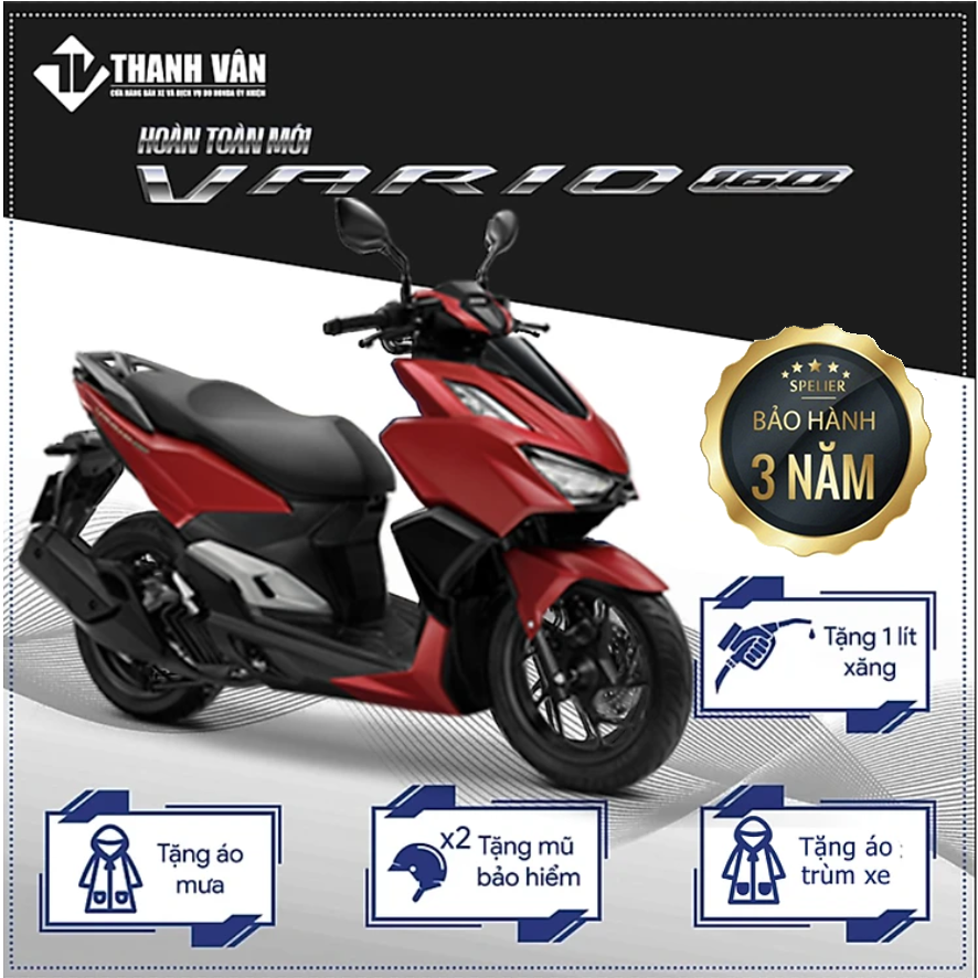 Thiết kế Lần đầu tiên được Honda Việt Nam giới thiệu, với thiết kế của mẫu xe ga thể thao độc đáo, năng động và linh hoạt trên từng cung đường, động cơ eSP+ 4 van 160cc đầy uy lực cùng những tiện ích vượt trội; VARIO 160 hứa hẹn sẽ mang lại những trải nghiêm vô cùng ấn tượng cho khách hàng luôn sống hết mình với đam mê. Thiết kế mang DNA thể thao VARIO 160 sở hữu thiết kế thể thao, mới lạ, phù hợp với các khách hàng trẻ tuổi và năng động. Diện mạo xe bề thế mạnh mẽ mang tới hình ảnh trẻ trung độc đáo, nổi bật dưới mọi góc nhìn. Hệ thống khung dập hàn laser thế hệ mới eSAF Khung dập hàn laser thế hệ mới eSAF được tạo ra bởi các tấm kim loại dập, sử dụng công nghệ hàn laser giúp giảm trọng lượng, tăng độ dẻo dai, mang lại trải nghiệm lái thoải mái. Mặt đồng hồ LCD hiện đại Mặt đồng hồ LCD kỹ thuật số thiết kế khoa học, dễ dàng quan sát với các thông tin được hiển thị đầy đủ như hành trình, tốc độ, mức tiêu thụ nhiên liệu, hệ thống đèn cảnh báo, thông số điện áp ắc quy... Bánh xe kích thước lớn VARIO 160 được trang bị bộ lốp lớn và dày giúp tăng khả năng bám đường và sự ổn định khi vận hành. Kích thước lốp lớn (100/80-14 cho bánh trước và 120/70-14 cho bánh sau) kết hợp với bộ mâm hình chữ Y góp phần tạo nên hình ảnh mạnh mẽ và nổi bật. Hệ thống chống bó cứng phanh (ABS) Hệ thống chống bó cứng phanh ABS cho bánh trước (được trang bị trên Phiên bản Thể thao và Phiên bản Đặc biệt) giúp ổn định sự cân bằng của xe, đặc biệt trong trường hợp phanh gấp khi đang đi ở tốc độ cao hoặc trên đường trơn ướt, mang lại cảm giác an tâm hơn khi vận hành xe. Khối động cơ eSP+ 4 van 160cc hoàn toàn mới VARIO 160 sở hữu khối động cơ eSP+ 4 van - thế hệ động cơ mới nhất hiện đang được áp dụng trên các mẫu xe ga cao cấp của Honda Việt Nam. Đây là bước đột phá trong công nghệ động cơ của Honda, giúp tăng công suất, vận hành êm ái, tiết kiệm nhiên liệu và thân thiện môi trường. Dung tích động cơ 160cc mang lại khả năng vận hành mạnh mẽ và vượt trội cho người lái trong di chuyển hàng ngày. Hệ thống đèn LED nổi bật Công nghệ LED được trang bị đồng bộ cho hệ thống đèn giúp tiết kiệm nhiên liệu và tăng độ nhận diện. Cụm đèn LED phía trước thiết kế tinh xảo, đèn định vị ban ngày được tách rời tạo đường nét sắc sảo. Đèn hậu nằm gọn phía đuôi xe và tách rời với đèn xi nhan sau tạo hiệu ứng 3D đặc trưng trên mọi góc nhìn. Hộc đựng đồ phía trước rộng kết hợp cổng sạc USB tiện lợi VARIO 160 sở hữu 2 hộc chứa đồ phía trước rộng rãi, đặc biệt hộc chứa đồ bên trái được trang bị nắp che tích hợp cổng sạc USB loại A tiện lợi với công suất tối đa là 10,5W (5V – 2,1A) cho phép sạc pin điện thoại trong khi đang di chuyển. Hộc đựng đồ dưới yên rộng rãi Hộc đựng đồ dung tích lớn với thể tích 17,9 lít cho phép chứa 1 mũ bảo hiểm nửa đầu cùng nhiều vật dụng cá nhân khác. Hệ thống khóa thông minh Smart Key Với thao tác đơn giản, khóa điện mở xe, khóa cổ xe, định vị xe cùng chức năng báo động được tích hợp trên thiết bị điều khiển FOB gia tăng sự tiện ích, an tâm cho khách hàng. THÔNG SỐ KỸ THUẬT Khối lượng bản thân Tiêu chuẩn/ Cao cấp: 117 kg Đặc biệt/ Thể thao: 118 kg Dài x Rộng x Cao Tiêu chuẩn/ Cao cấp:1929 mmx678 mmx 1088 mm Đặc biệt/ Thể thao:1929 mmx695 mm x 1088 mm Khoảng cách trục bánh xe 1.278 mm Độ cao yên 778 mm Khoảng sáng gầm xe 138 mm