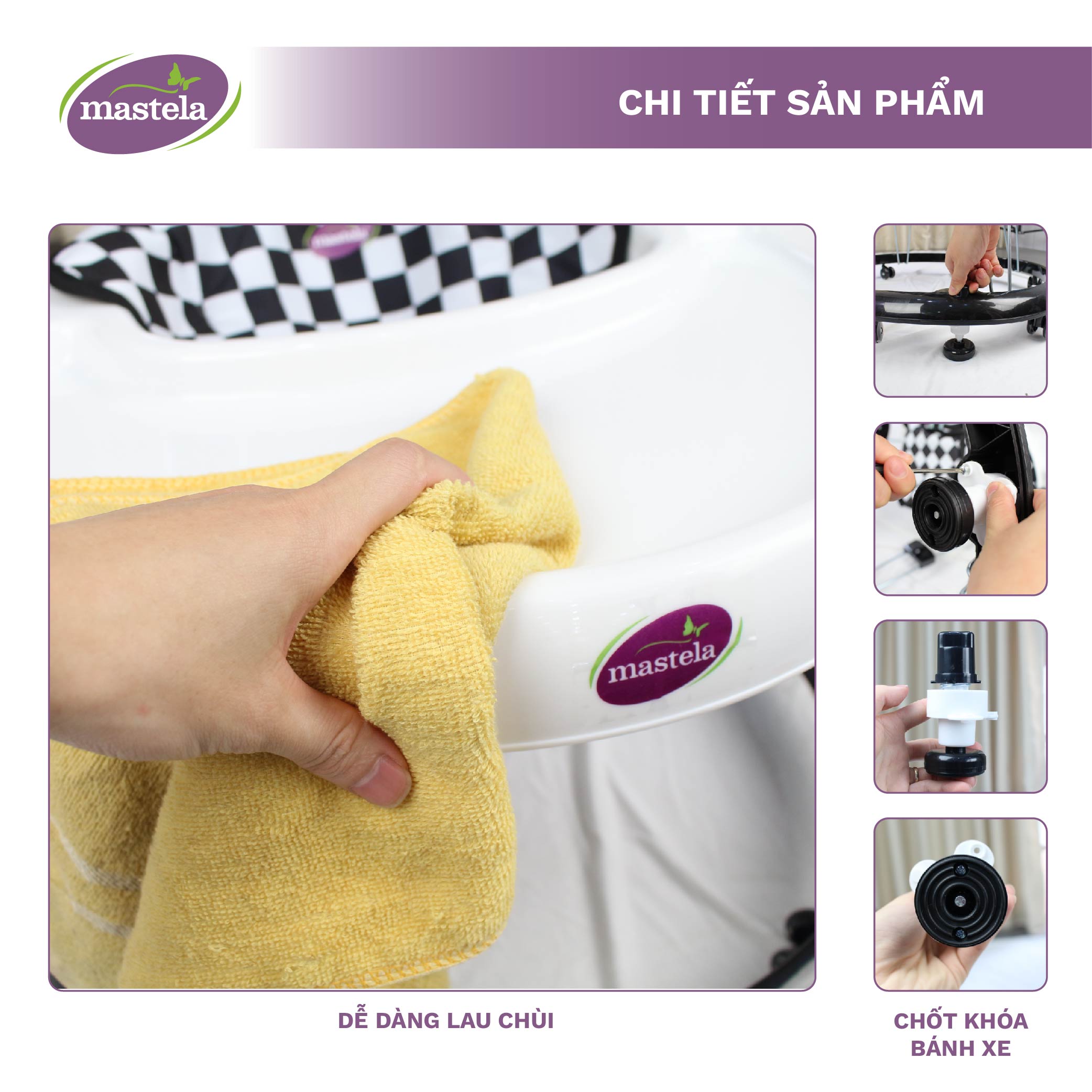 - Xe tập đi Mastela được thiết kế tinh tế với kiểu dáng tròn xinh xắn và độ thẩm mỹ cao. Sự kết hợp giữa màu trắng trang nhã và nâu thời trang mang lại sự tươi sáng cho chiếc xe, cùng các họa tiết nhí in tràn ngộ nghĩnh trên đệm, xe tập đi sẽ thu hút bé ngay từ cái nhìn đầu tiên. Khung xe chắc chắn