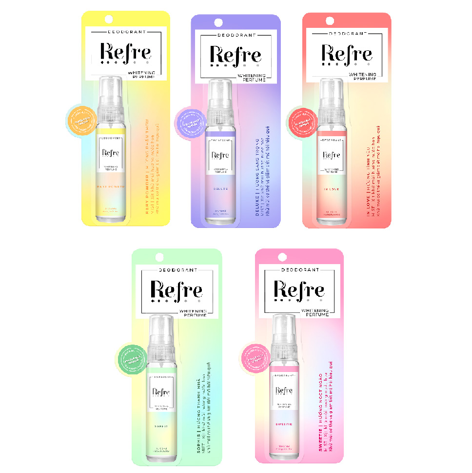 Mua tại TiktokĐặc tính sản phẩm Khử mùi cơ thể và giảm tiết mồ hôi hiệu quả. Công nghệ Fragrance Sensor ĐỘC QUYỀN - khóa mùi tỏa hương thật lâu. Dạng xịt tiện dụng, tránh tình trạng nhiễm khuẩn trở lại vào trong sản phẩm. Refre Whitening - bộ sưu tập hương nước hoa sang trọng gồm 5 mùi: