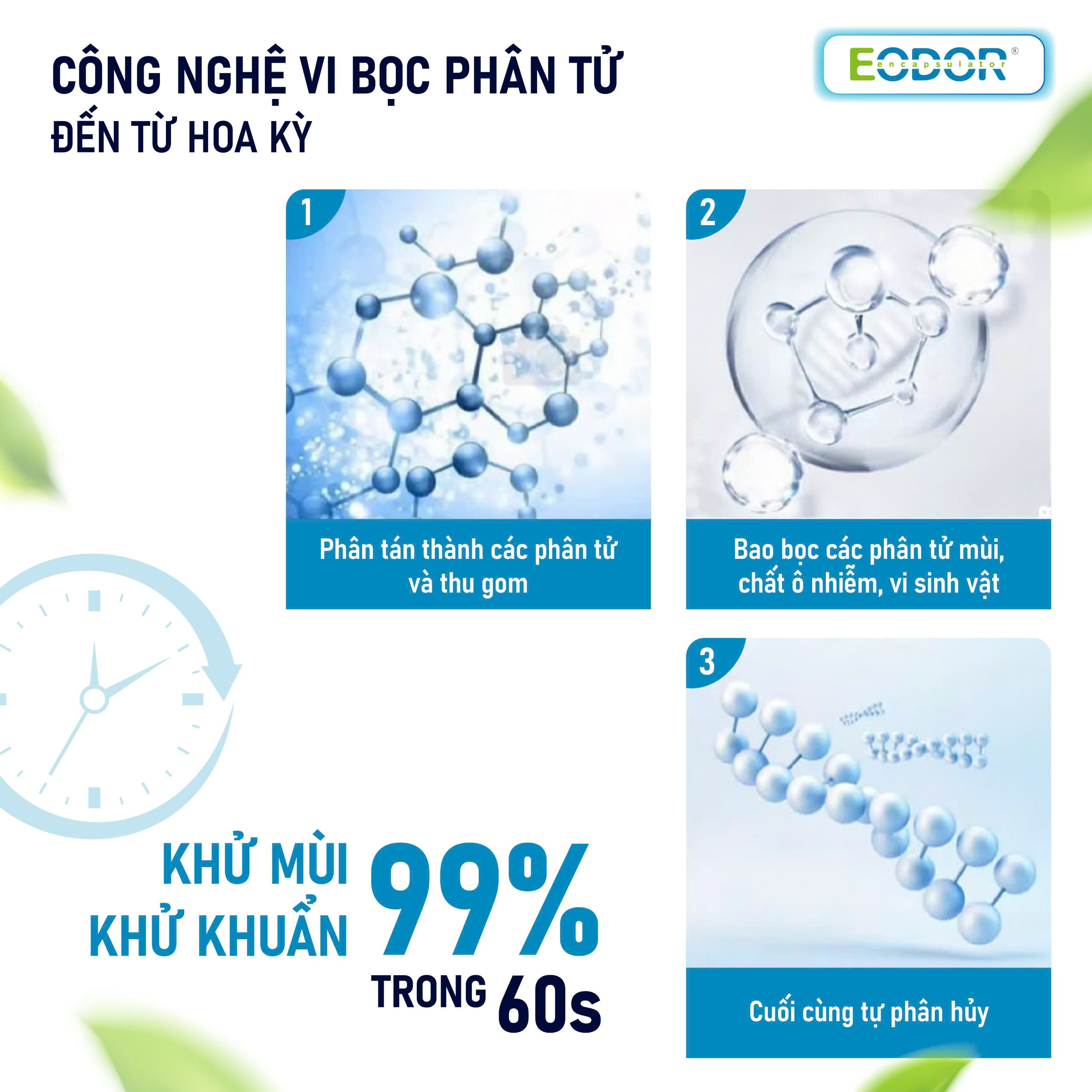 Khi các hạt EODOR xịt ra không khí hoặc lên bề mặt, với ứng dụng công nghệ vi bọc phân tử, các hạt EODOR sẽ phân tán thành các phân tử và thu gom, bao bọc (khóa) các phân tử mùi, chất gây ô nhiễm, vi sinh vật trong không khí, bề mặt rồi phân hủy tự nhiên.