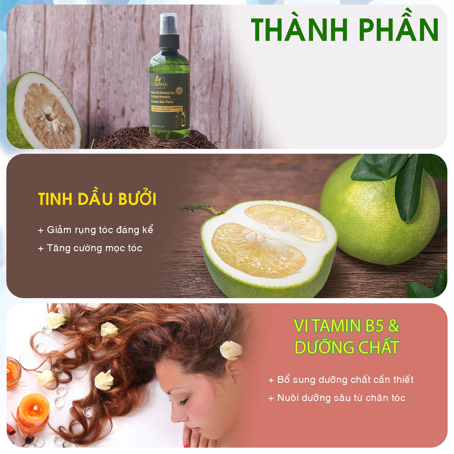 Nước dưỡng tóc tinh dầu bưởi (pomelo hair tonic) Tabaha 120ml Thành phần chính: - Tinh dầu vỏ bưởi: Do có tính kháng khuẩn và chống oxy hóa cao, tinh dầu vỏ bưởi giúp ngăn