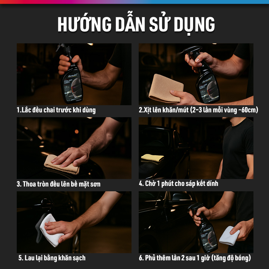 Xịt Phủ Bóng Màu Bạc Ceramic Color Wax Formula 1 – Làm Mới Sơn Xe Bạc, Bóng Sâu, Chống Tia UV Thông số sản phẩm Thông tin Chi tiết Tên sản phẩm Xịt Phủ Bóng Ceramic Color Wax Formula 1 Màu sử dụng Xe sơn bạc / sơn xám Dung tích 23oz (680ml) SKU 617724 Thành phần chính Ceramic Polymers, SiO₂, hạt màu bạc Xuất xứ Hoa Kỳ Hãng sản xuất Formula 1 (USA)   Các tính năng nổi bật Phục hồi màu sơn bạc sống động Các hạt màu bạc siêu mịn giúp làm tươi lại màu sơn bạc bị xỉn, bạc màu do thời tiết. Phủ gốm SiO₂ – Bóng sâu & bảo vệ lâu dài Tạo lớp phủ ceramic chống bám bẩn, chống thấm nước và chống trầy xước nhẹ. ️ Chống tia UV & oxy hóa Ngăn sơn bị bạc màu, phai màu khi đậu xe ngoài trời lâu ngày. Dễ sử dụng – không cần kỹ thuật Chỉ cần xịt, lau đều, chờ khô và lau lại – không cần máy móc, phù hợp cả người mới dùng.