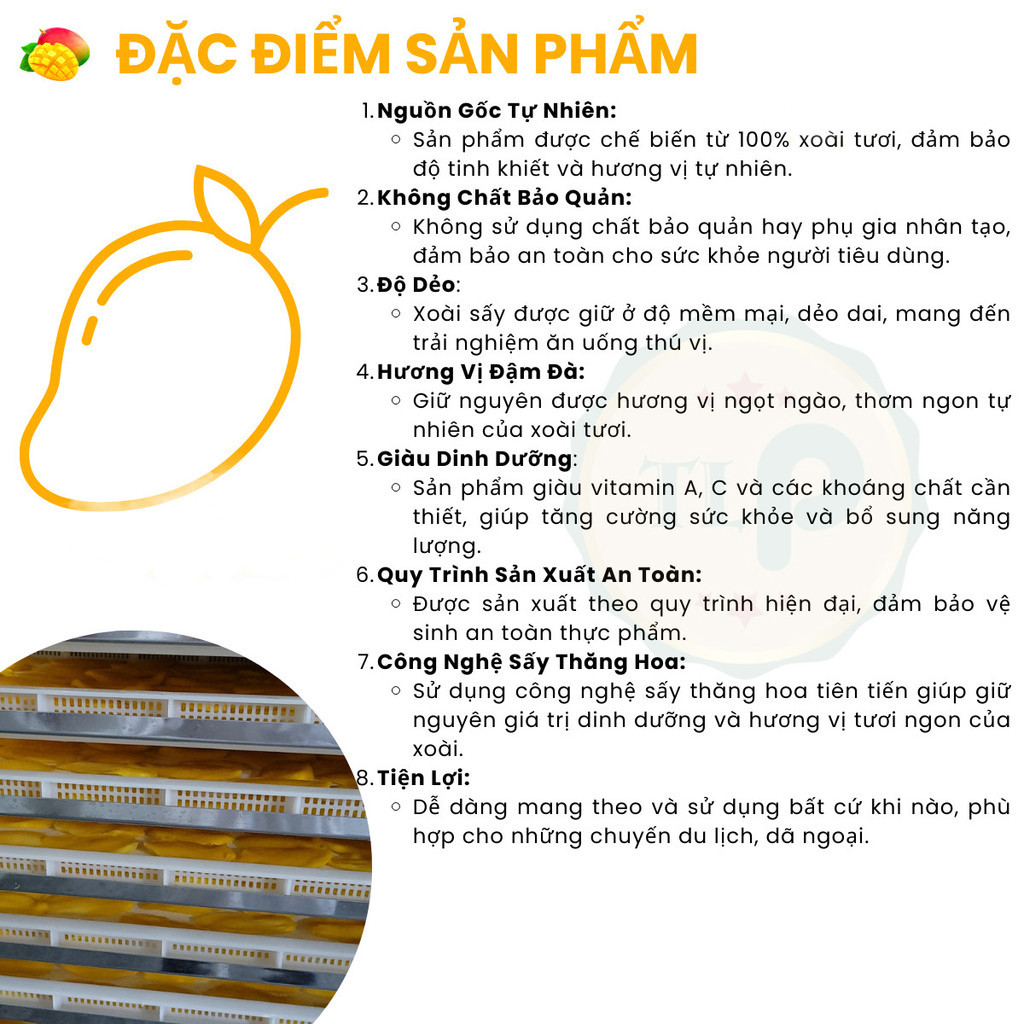 Xoài sấy dẻo có vị ngọt thanh và chua tự nhiên, đậm vị xoài tươi, màu vàng xoài cát, dẻo mềm không cứng, có dạng gần như nguyên miếng xoài, không vụn. Thành Phần: 100%