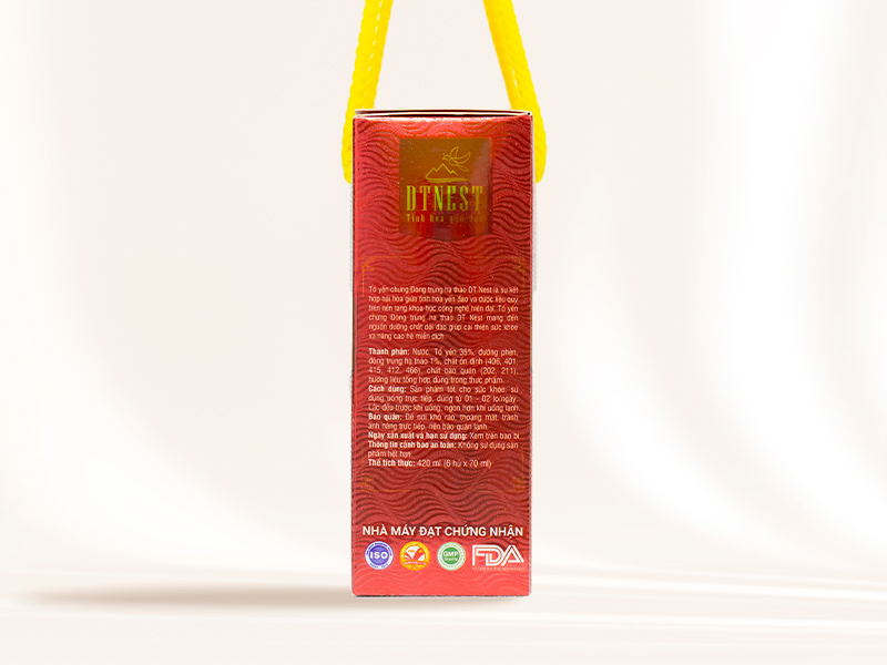 - Yến sào: Hỗ trợ tăng sức đề kháng cho cơ thể, chống lão hóa, ổn định thần kinh, trí nhớ, kích thích tiêu hóa, phục hồi sức khỏe nhanh chóng trong thời gian dưỡng bệnh. Đối tượng sử dụng: thích hợp cho mọi đối tượng đăc biệt trẻ từ 3 tuổi trở lên Sản xuất: Việt Nam Thành phần: Nước, , Yến sào (25%), đường phèn (4%) , chất ổn định (E406), hương liệu dùng cho thực phẩm. Cách dùng: - Lắc nhẹ trước khi uống, ngon hơn khi uống lạnh, tránh đun nóng sản phẩm trước khi sử dụng. - Uống trực tiếp từ lọ. --Uống từ 1 - 2 lọ/ngày. Sản phẩm thích hợp cho người lớn tăng sức đề kháng giúp cơ thể khỏe mạnh, phục hồi sức khỏe cho người bệnh, Không sử dụng sản phẩm khi hết hạn, nên sử dụng một lần sau khi mở nắp.
