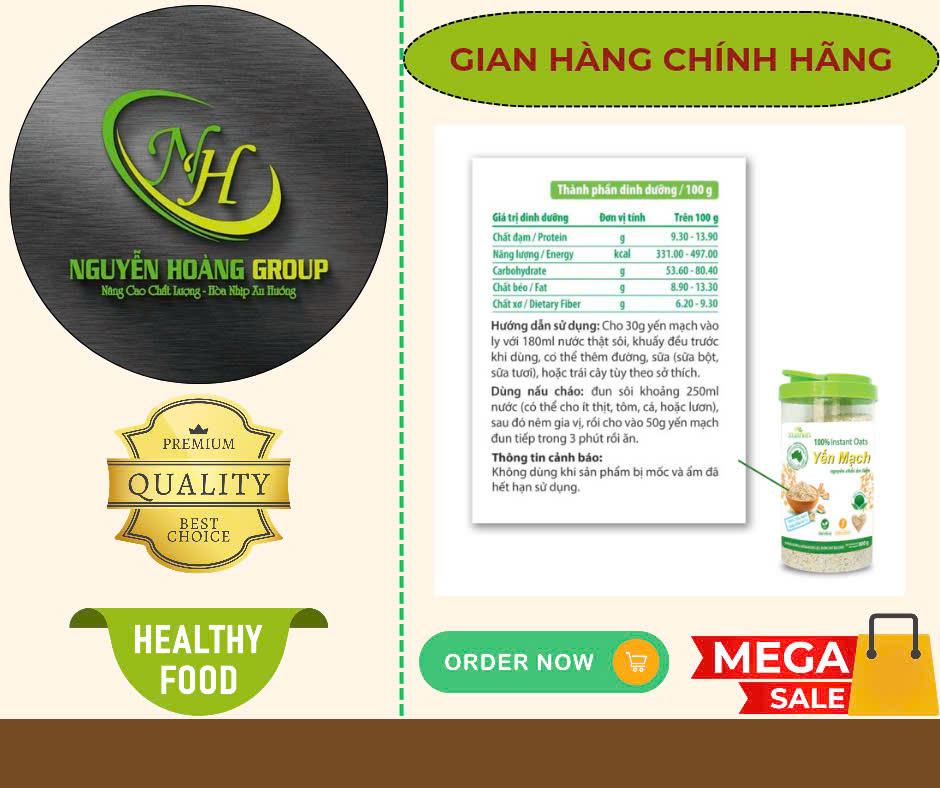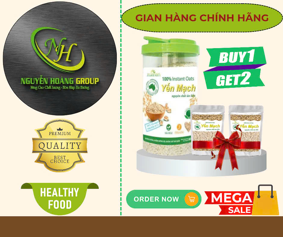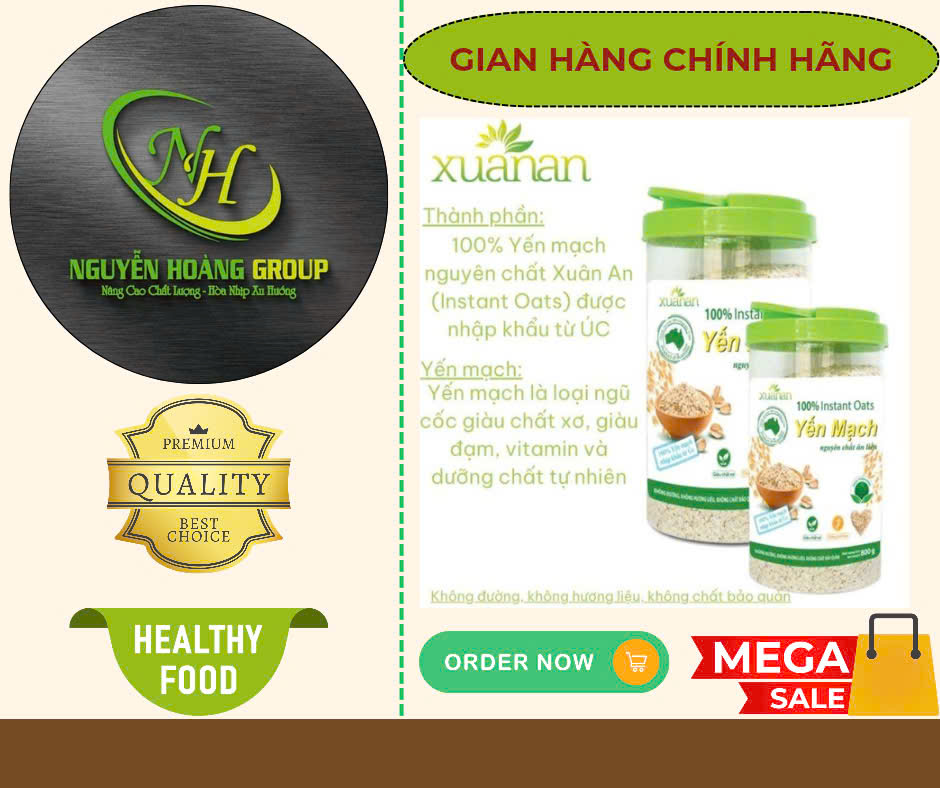 Yến Mạch Nguyên Chất Ăn Liền Xuân An Thành Phần : 100% Yến Mạch Nhập Khẩu Từ Úc Công Dụng: Là Loại ngũ cốc siêu tốt Thêm yến mạch vào khẩu phần ăn hàng ngày giúp giảm nguy cơ bệnh tim mạch, tiểu đường , cao huyết Áp, Giảm Lượng Colesterol trong máu , phòng chóng bệnh ung thư , loãng xương, béo Phì . Yến Mạch giúp tăng khả năng tập trung , tránh suy nhược thần kinh , tăng cường hệ miễn dịch cho cơ thể. Yến mạch cung cấp chất dinh dưỡng thiết yếu cho cơ thể , tăng khả năng chống viêm , làm lành vết thương. Yến mạch dùng để nấu cháo, rất giàu giá trị dinh dưỡng và chất xơ do đó rất tốt cho người bị táo bón Đối tượng sử dụng : Phù hợp tất cả mọi đối tượng : trẻ em , người lớn , người già Đặc biệt rất tốt cho người ăn kiêng , béo phì và người bị tiểu đường Quy cách đóng gói : 400g/ Túi Cách Dùng: Dùng để nấu cháo: Đun sôi 250ml nước cùng với ( Tôm , Cá , Lươn, Thịt Heo , Thịt gà, Thịt Bò, hoặc nấu chay thì thêm Nấm , Rau Củ) Sau đó nêm gia vị và 50g Yến Mạch Xuân An đun tiếp trong 3 phút rồi dùng. Sản Phẩm Yến Mạch Xuân An : Không hương Liệu , Không Chất Bảo Quản, Hoàn toàn từ tự nhiên. Hạn Sử Dụng: 12 tháng từ ngày sản xuất Xuất Xứ : Úc