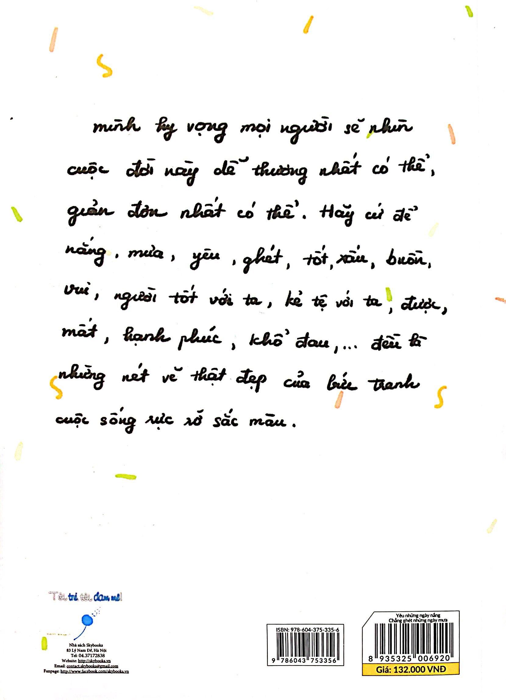 Mong rằng với “Yêu những ngày nắng Chẳng ghét những ngày mưa” bạn sẽ được truyền một chút cảm hứng để vẽ mọi thứ xung quanh cuộc sống của mình, theo một cách giản đơn hơn, dễ thương hơn, mang nhiều tình yêu thương hơn. Bạn không cần vẽ giống bất cứ ai, cũng không cần vẽ thật nắn nót, hãy cứ sáng tạo và tìm tòi. Hãy để cuốn sách này mang dấu ấn riêng của bạn, mang cả những tâm tư, góc nhìn của bạn.