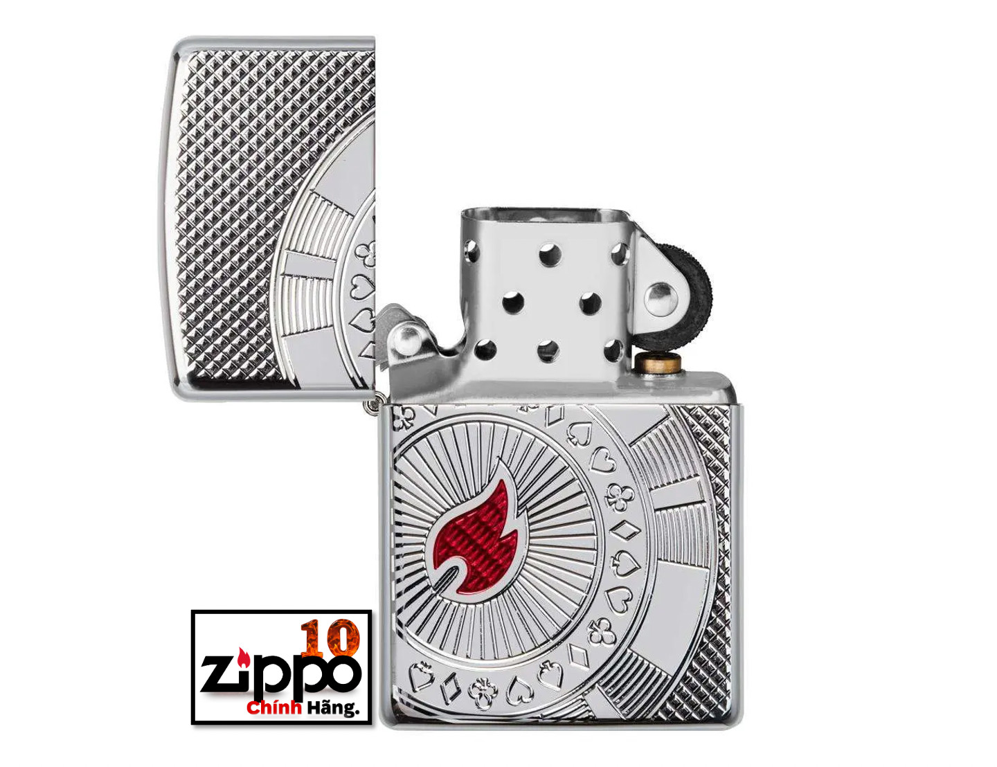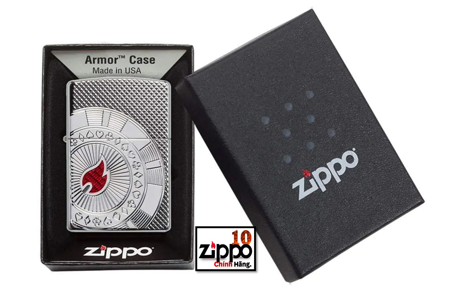 Đây Armor Polish Chrome hiển thị sáng hơn một thiết kế chip poker thanh lịch. Chip poker được tạo ra bằng cách sử dụng quy trình khắc sâu trong khi ngọn lửa Zippo tập trung vào chip mang lại màu đỏ cho thiết kế bằng quy trình inlay epoxy. Được đóng gói trong một hộp đựng dạng quà tặng. Để tối ưu hiệu suất, hãy dùng nhiên liệu bật lửa của Zippo.
