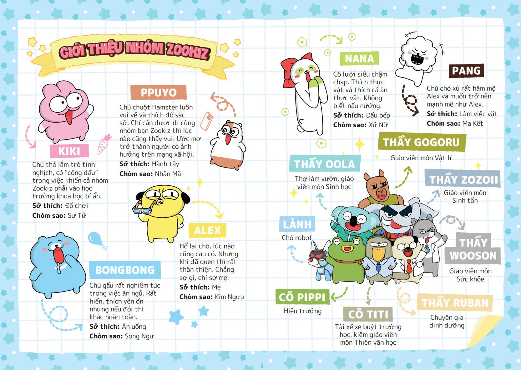 Nhóm Zookiz quy tụ những bạn nhỏ tinh nghịch mà đáng yêu: thỏ Kiki láu lỉnh, gấu Bongbong ham ăn, “hổ chó” Alex hay càu nhàu, chuột cảnh Ppuyo ngốc nghếch, lười Nana điệu đà, chó xù Pang ham vui. Theo chân Zookiz, các độc giả nhỏ sẽ bước vào những cuộc phiêu lưu kì thú và hài hước tại trường khoa học bí ẩn đồng thời học thêm nhiều kiến thức bổ ích.